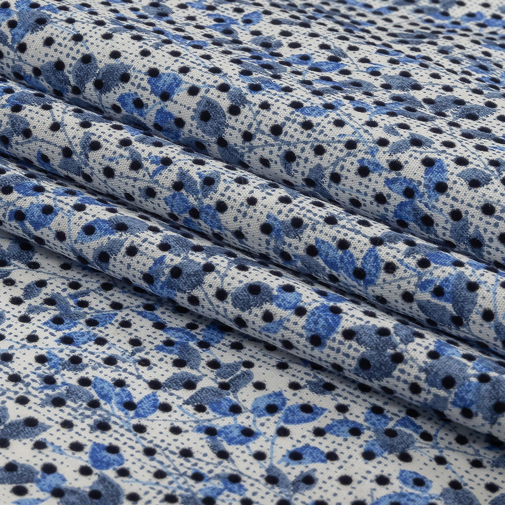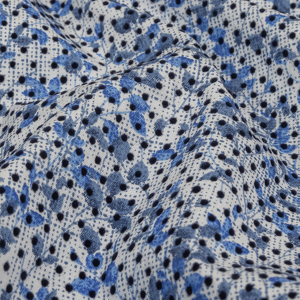 Black Flocked Polka Dots on Blue and White Leaves and Dots Stretch Cotton Shirting