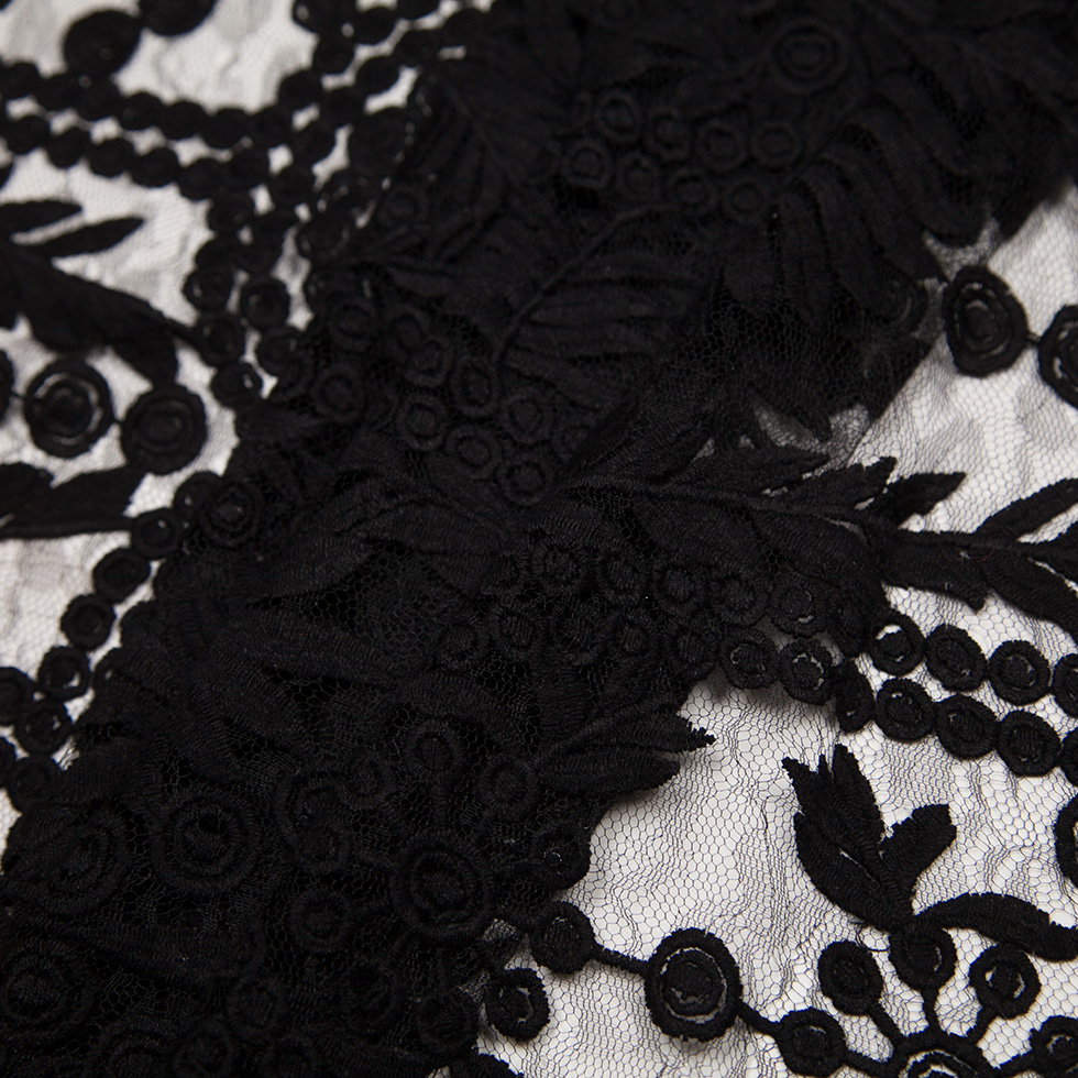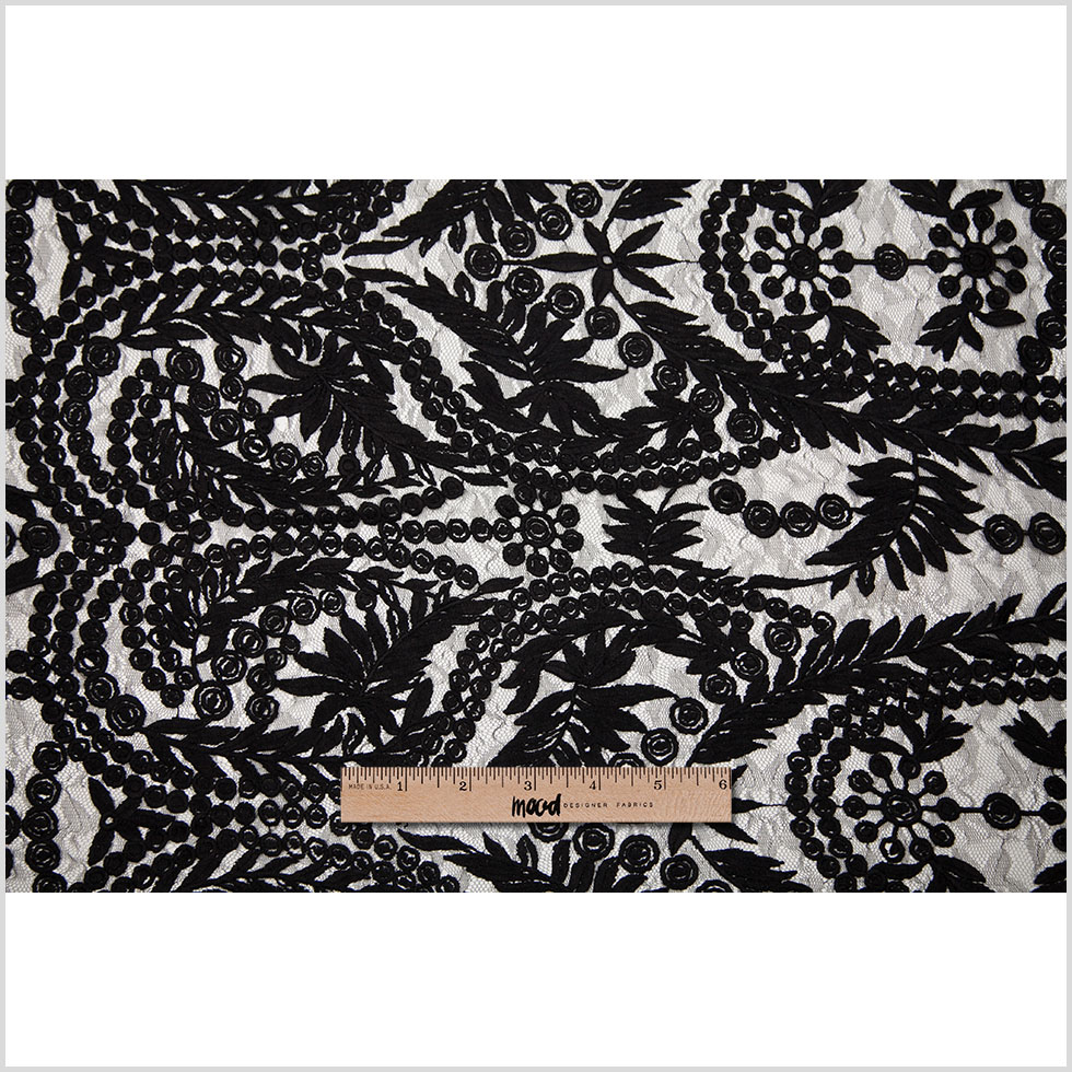 A vigorous pattern for one dynamic you! This charismatic lace does not contain your typical floral pattern. Instead it involves clusters of circles and leaves intertwined to give off a whimsical flare. Made from nylon, this lace is extremely soft to the touch and oh so fluid, one can not resist it's vintage charm. Striking floor-length vests and excitingly sheer maxi-dresses are just the beginning for what you can create with this magnificent material. A trend-setter to say the least!