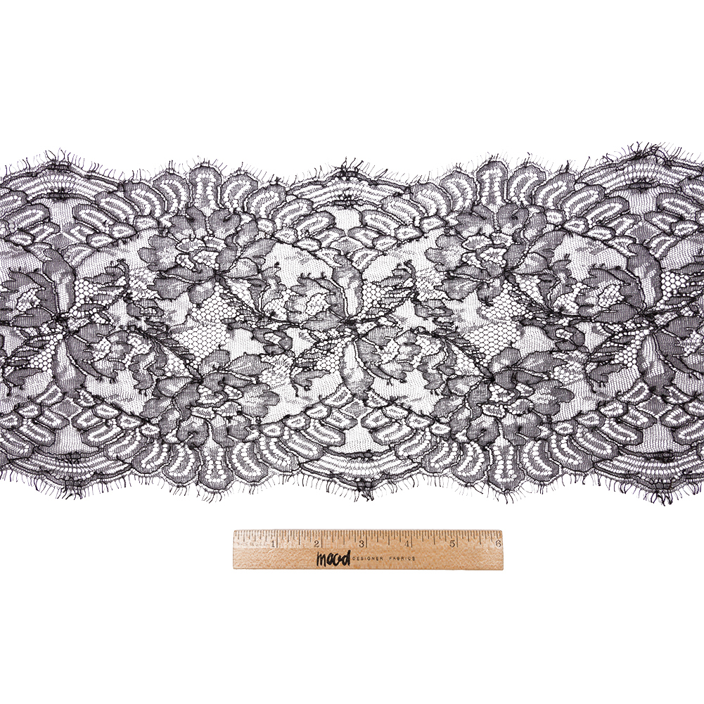 Exude the confidence and beauty of Black Widow with this Black Flowers and Scallops Re-Embroidered Lace Trim with Eyelash Fringe. As delicate as a spiderweb, this shockingly thin 8-inch-wide lace has a crisp hand, an airy drape, and a slight mechanical stretch. The design features flowers, outlined by a slightly thicker black thread, and scalloped edges that are topped off with eyelash fringe. Create sultry lingerie or adorn date night dresses and black silk blouses!