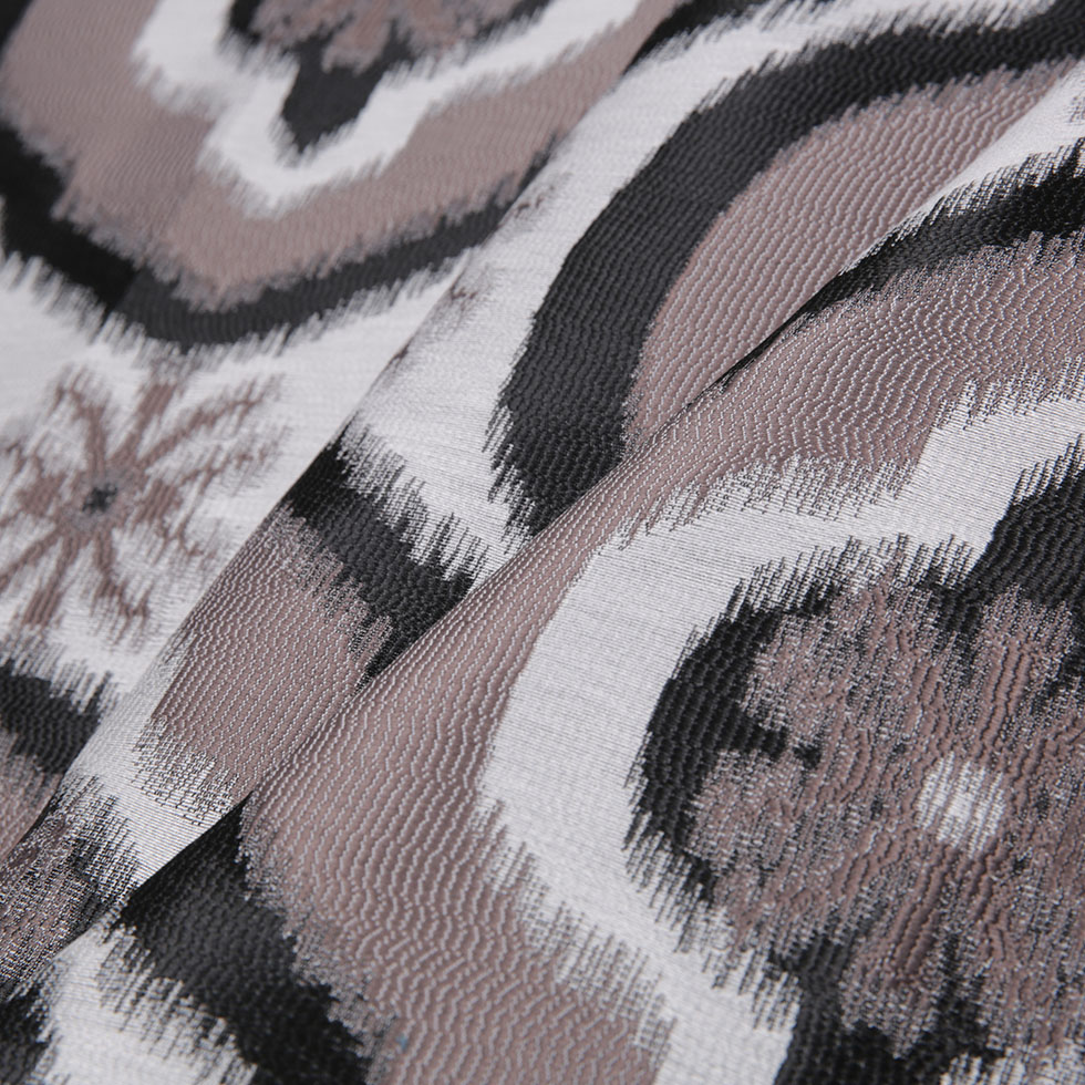 From home and hotel interiors to restaurants and clubs, there is no doubt that this audacious collection of home decor fabrics will ultimately spice up any upcoming decorative endeavors. Sporting a large-scaled damask pattern centered by what looks like crystallized snow flakes, this ikat polyester woven is luminous, visually dynamic, and exudes a burst of energy. And it comes in six sensational color combinations. Of a lighter-weight, dense, and with a crisp drape, this polyester woven will be best suited for pillows, cushions, small upholstery projects, and some drapery applications.
