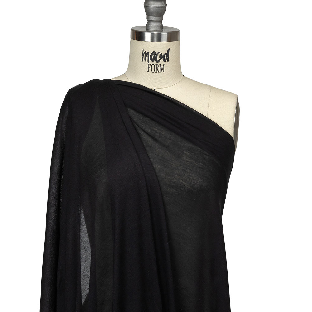 Enjoy cozy couture and brilliant basics with this Black Lightweight Rayon Jersey! The soft feel, supple drape, and 30% widthwise stretch lend themselves easily to T-shirts, tank tops, wrap dresses, and more.