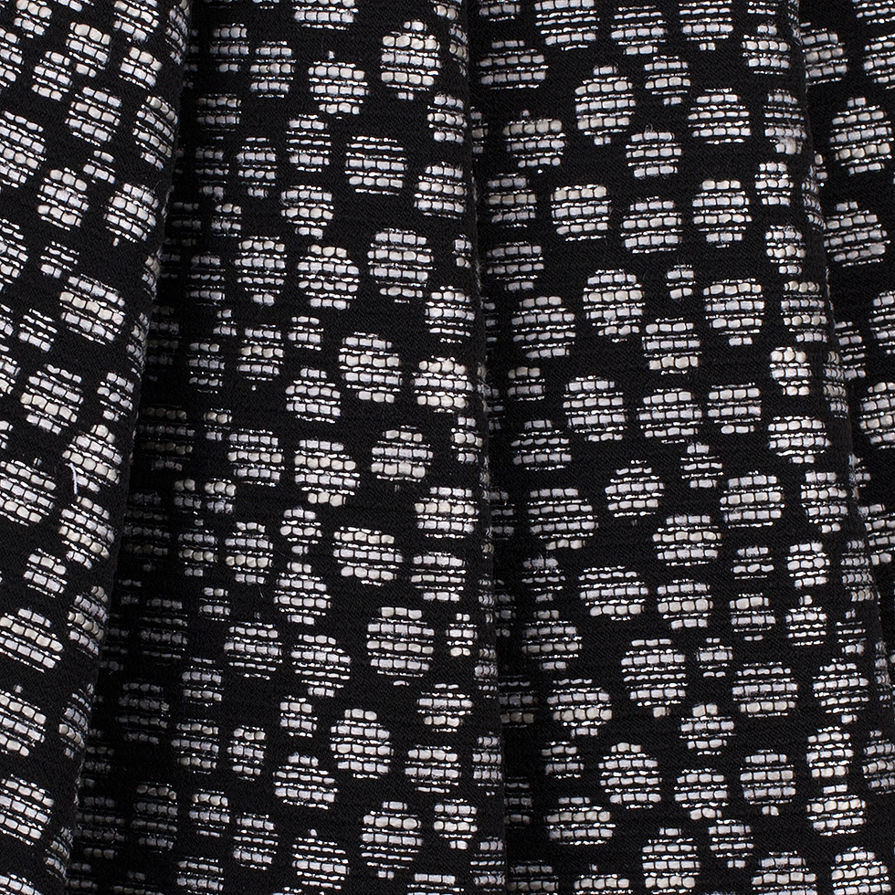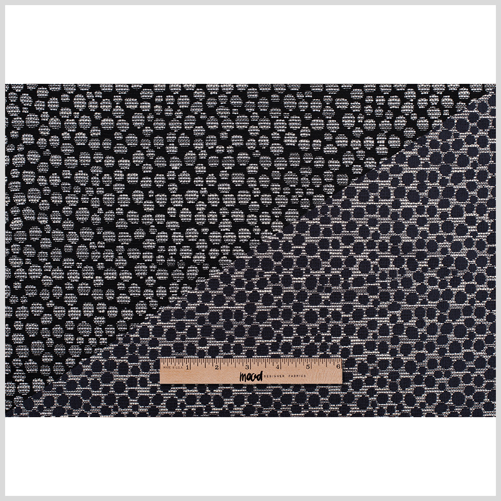 Double faced for double the fun! Presenting this riveting Black and Navy Metallic Polyester Jacquard involving a bubbly pattern intercepted with textural, horizontally running stripes in white and metallic silver. The face of this fabric contains white bubbles atop a black backdrop where as the backside contains navy bubbles atop a white backdrop. Of a lighter weight than expected and with a rather workable drape, alter this dazzling Jacquard into riveting jackets, dresses, crop tops and bottoms. Of the highest opacity, lining this material remains dependent on personal preference.