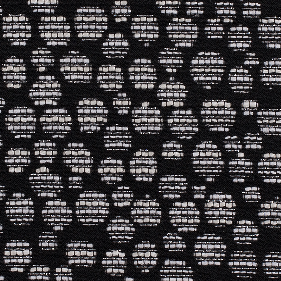 Double faced for double the fun! Presenting this riveting Black and Navy Metallic Polyester Jacquard involving a bubbly pattern intercepted with textural, horizontally running stripes in white and metallic silver.