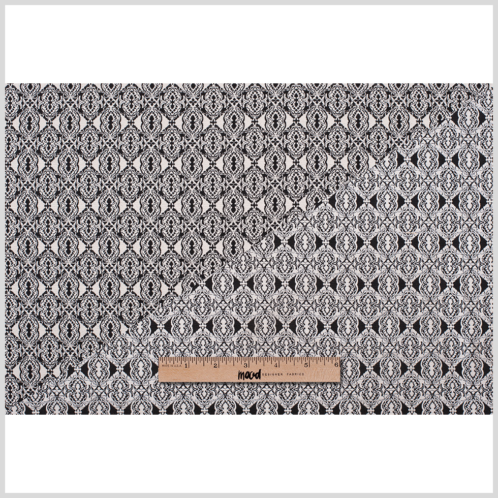 On the hunt for brilliant brocades and jazzy jacquards? Why not take a look at this complex cotton?! Faced with primarily off-white yarns and black to back it up, this jacquard contains a wonderfully textured surface matched by a riveting geometric diamond pattern. Although the back of this material does not contain a dynamic textural element like the front, the reversed pattern is just as brilliant and can be worked in as the face. Use this double-faced cotton in the creation of stylistic jackets, bottoms, dresses, etc. As it is completely opaque, lining this material remains dependent on personal preference.