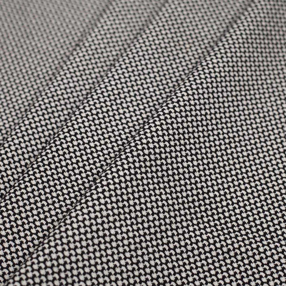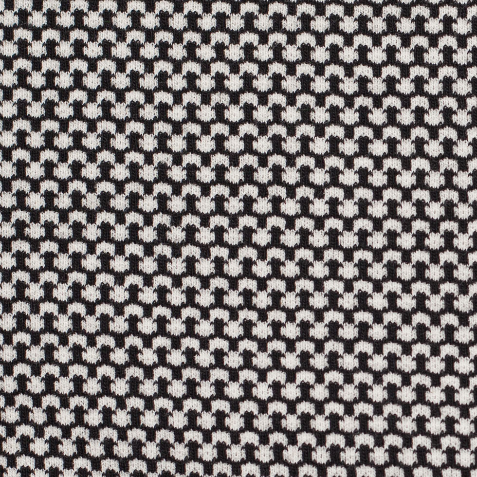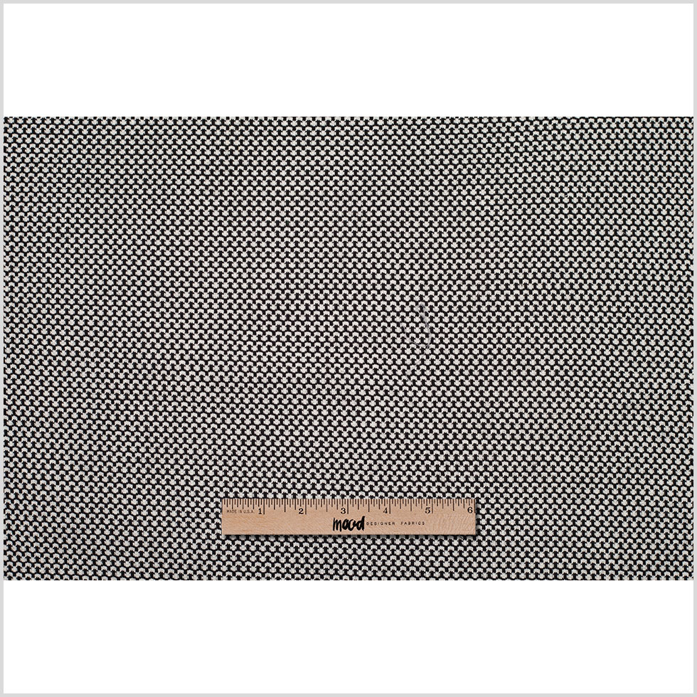 A little patterned knit fits into any wardrobe anytime, hands down! This black and off-white thick jersey knit stretches a little bit in both directions so it can be worked into a variety of different shapes and styles.