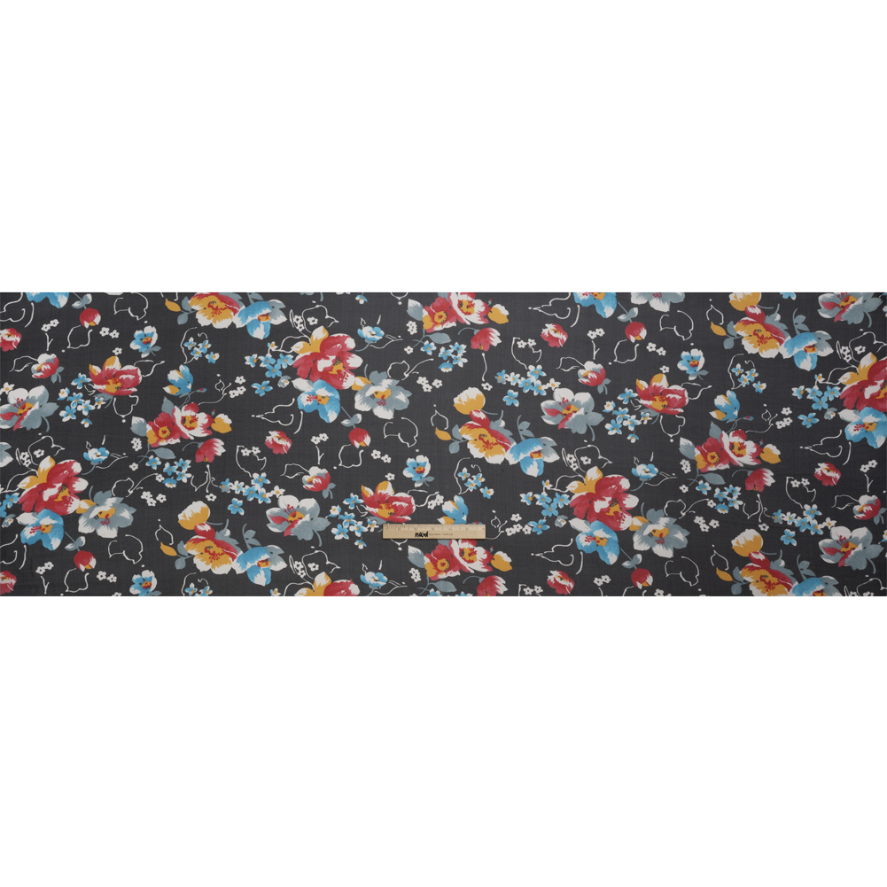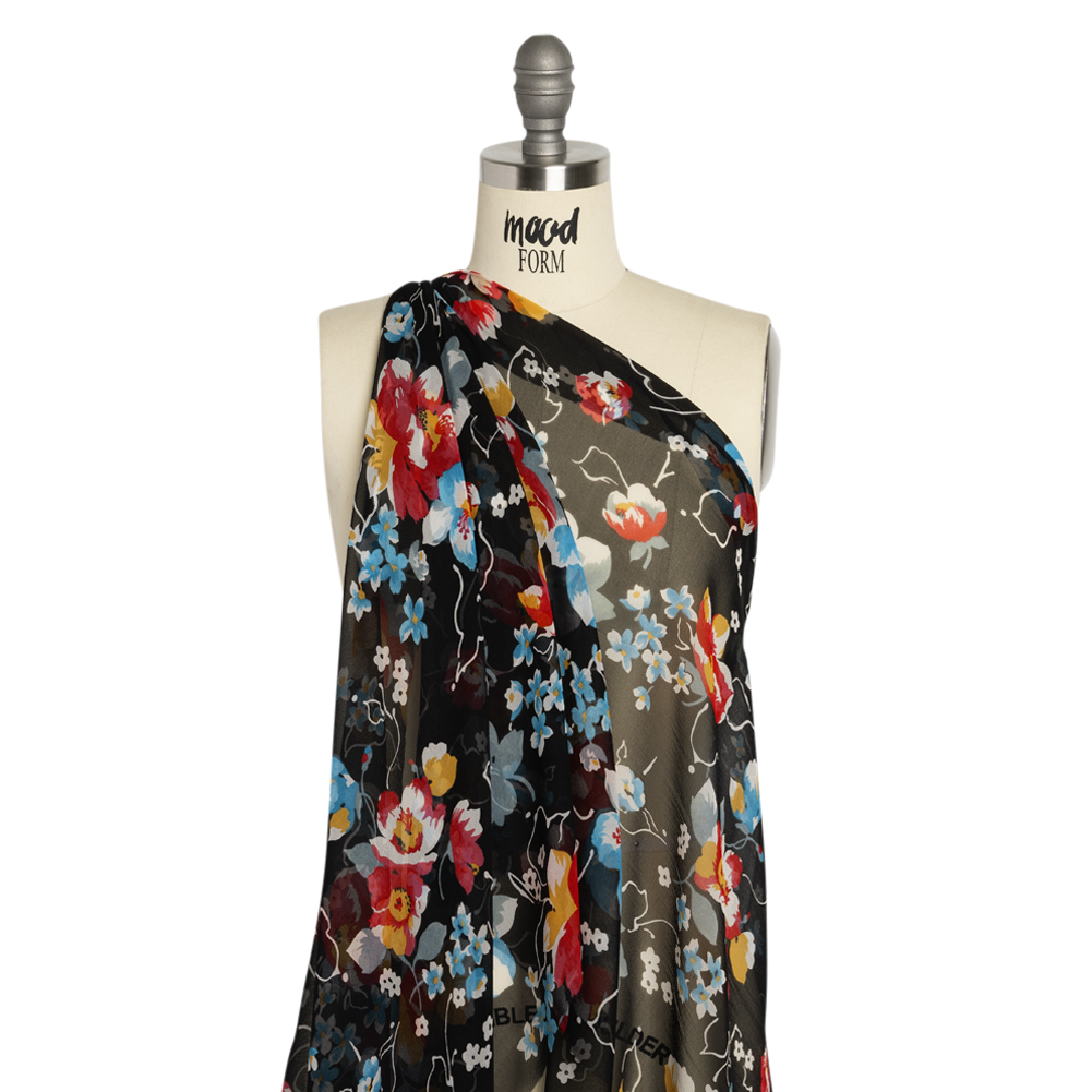 Gusts of winds rattle the cherry blossom trees, causing the flowers to fall like confetti across this Black, Red and Blue Floral Silk Chiffon. Coming in like a lion, the March weather tosses white, red, blue, and yellow flowers around a midnight sky. Romanticize any silhouette with silk chiffon’s sheer quality and airy drape. A slightly grainy hand accompanies this ethereal fabric, inspiring floor-length gowns, dusters, blouses with ruffled sleeves, scarves, and more. A tip from our sewists: do not feel intimidated by sewing this delicate fabric; using a rotary cutter (or sharp scissors and sharp pins), fine needles, tight stitching, French seams, and patience, anyone can show up to a special occasion wearing a silk chiffon garment they created themselves!