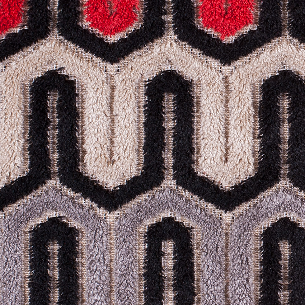 A rich velvet tapestry fabric with a classic geometric design. Heavyweight. Red, black and gray.