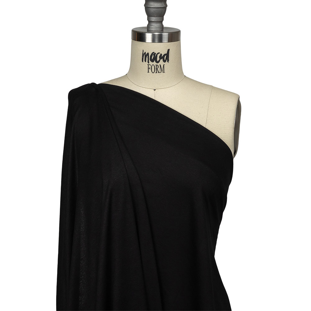 Go beyond your basic knitwear with our Black Slubbed Stretch Rayon Jersey! Fluid and lightweight, this soft jersey bears a distinct slubbed texture, similar to that of linen. Blessed with a 75% widthwise stretch, plus a little extra along the length, create T-shirts, wrap dresses, tank tops, bodysuits, and more. Translucent, a lining is not recommended for most topweight projects but a self-lining can improve opacity when needed.