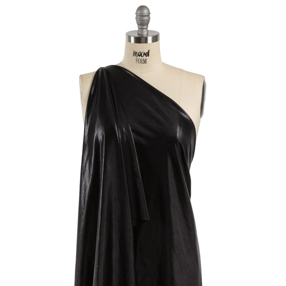 Slide into this sleek Black Tiny Dots Foiled Stretch Polyester Jersey for your next night out! Light bounces off of the black dots, covering the black jersey, like moonlight shining on wet grains of sand. This fabric is luxurious; the drape falls fluidly, the back is remarkably smooth, and the face is mesmerizingly lustrous. Leggings, bodycon dresses, and bralettes maximize the 50% weftwise stretch, welcoming movement and dance into your agenda with ease.