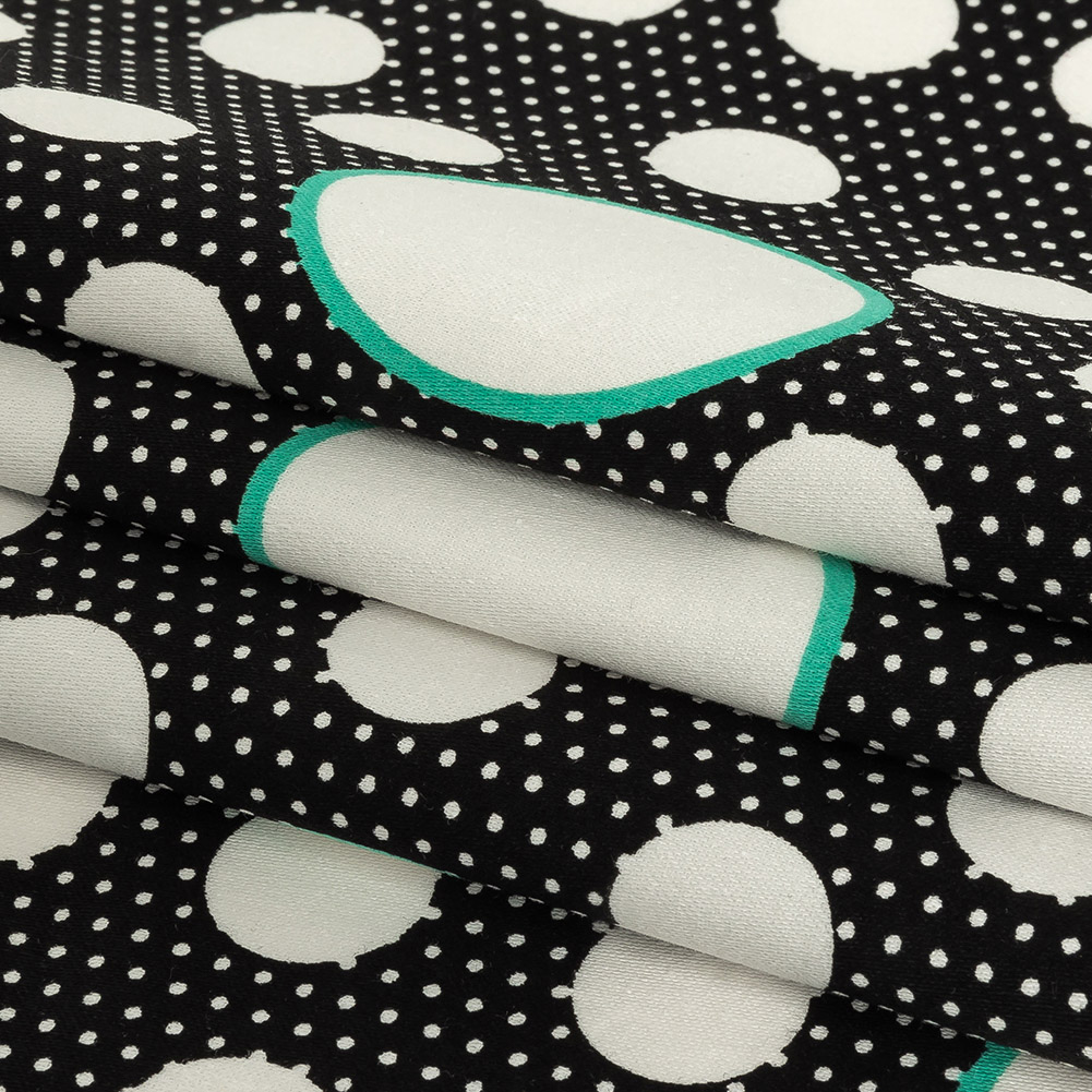 This Black, White Alyssum and Bright Seafoam Polka Dots and Stripes Stretch Cotton Sateen transports us to sharing milkshakes at a retro diner and twisting the night away! Soft with a crisp drape, varying sizes of white dots dance over a white and black polka-dotted ground, with the largest dots framed by bright pops of teal.