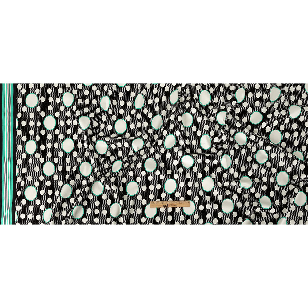 This Black, White Alyssum and Bright Seafoam Polka Dots and Stripes Stretch Cotton Sateen transports us to sharing milkshakes at a retro diner and twisting the night away! Soft with a crisp drape, varying sizes of white dots dance over a white and black polka-dotted ground, with the largest dots framed by bright pops of teal. A striped border measuring just over three inches runs along one selvage edge, making decorative hems a breeze. With just the right amount of widthwise give, fashion sock-hop ready skirts and sweet shirtdresses. This fabric is slightly translucent, therefore a lining may be added for opacity but isn't needed.