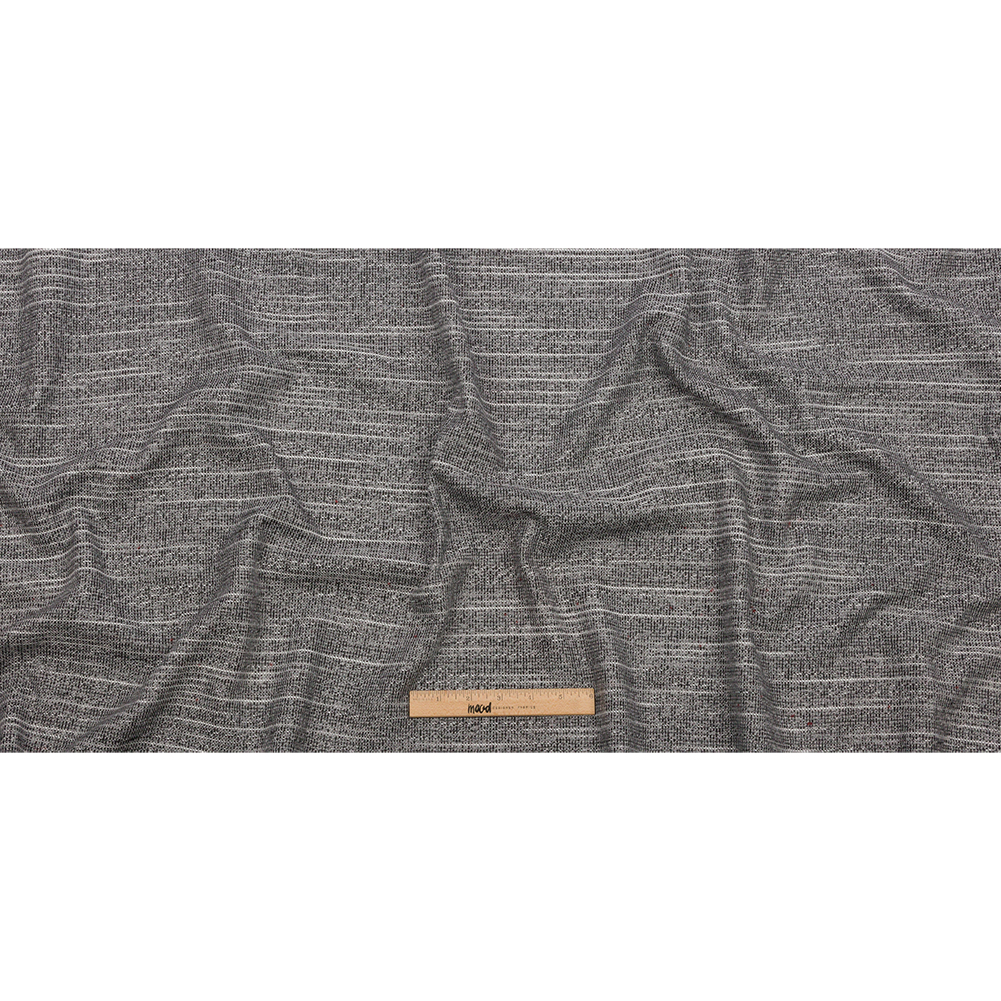 Let your confidence shine in this Black, White and Silver Metallic Polyester Tweed. A silver threading runs throughout the weave, giving the fabric a slight metallic shine. It features an easy drape and a tactile hand due to the weave. Capitalizing on tweeds' natural ability to retain heat, fashion formal lapel collared coats or take inspiration from iconic tweed suit jackets. Slightly translucent, a lining may be necessary for added opacity and structure.