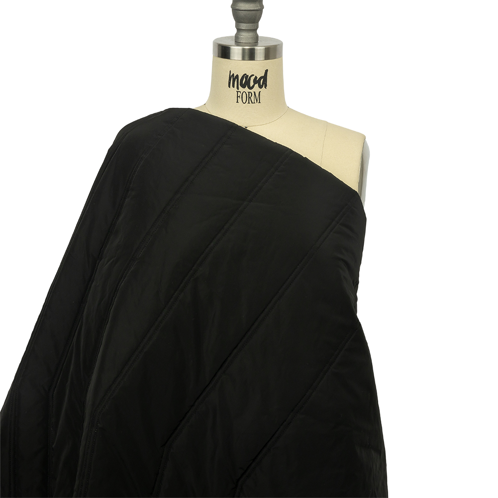 Allow your imagination to run wild with this Black Zig Zag Polyester Quilted Coating! With a slick surface, solid black is interrupted by a stitched zig-zag design, made plush by the inclusion of puffy batting. Without stretch, create puffer jackets, duvet coats, vests, duffle bags, and so much more. Opaque, a lining is recommended as the batting is exposed on the reverse.