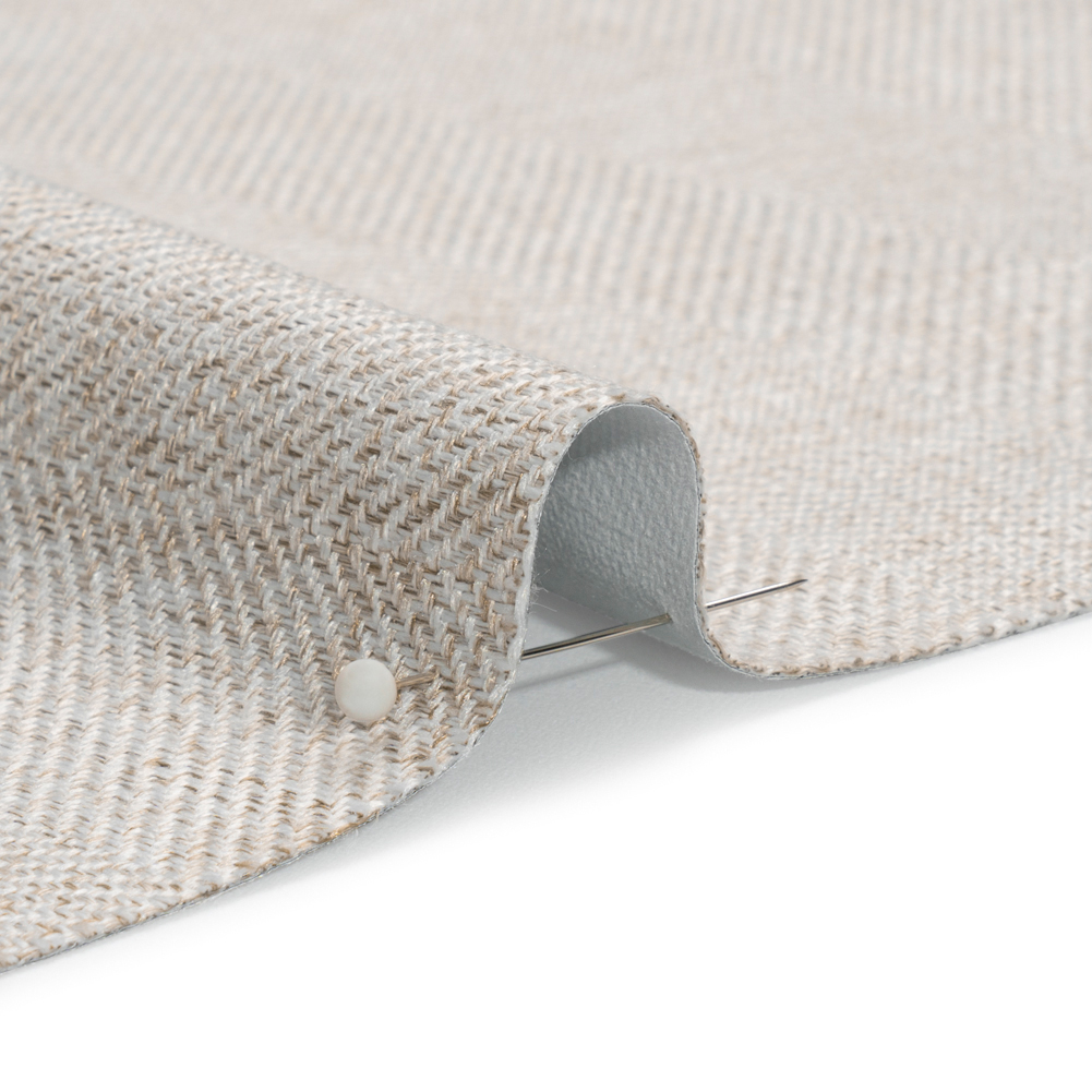 Create a cool oasis with this Tillery Almond Heathered Herringbone Striped Blackout Polyester Drapery Twill. This heathered white and tan fabric displays a collection of fine details that create a luxurious feel. Constructed with a herringbone weave, soft, lustrous diagonal ribs form stripes throughout the face while the back is a slightly fuzzy white material. Total sun block-out is guaranteed with these curtains; enjoy an afternoon nap, a lazy morning, and a midday movie in the dark! Plus, it acts as an extra layer of insulation from the sun's hot rays. The surprisingly malleable drape is perfect for long, pooling curtains or shorter panels. Due to the nature of this heavyweight fabric, a lining is not necessary.