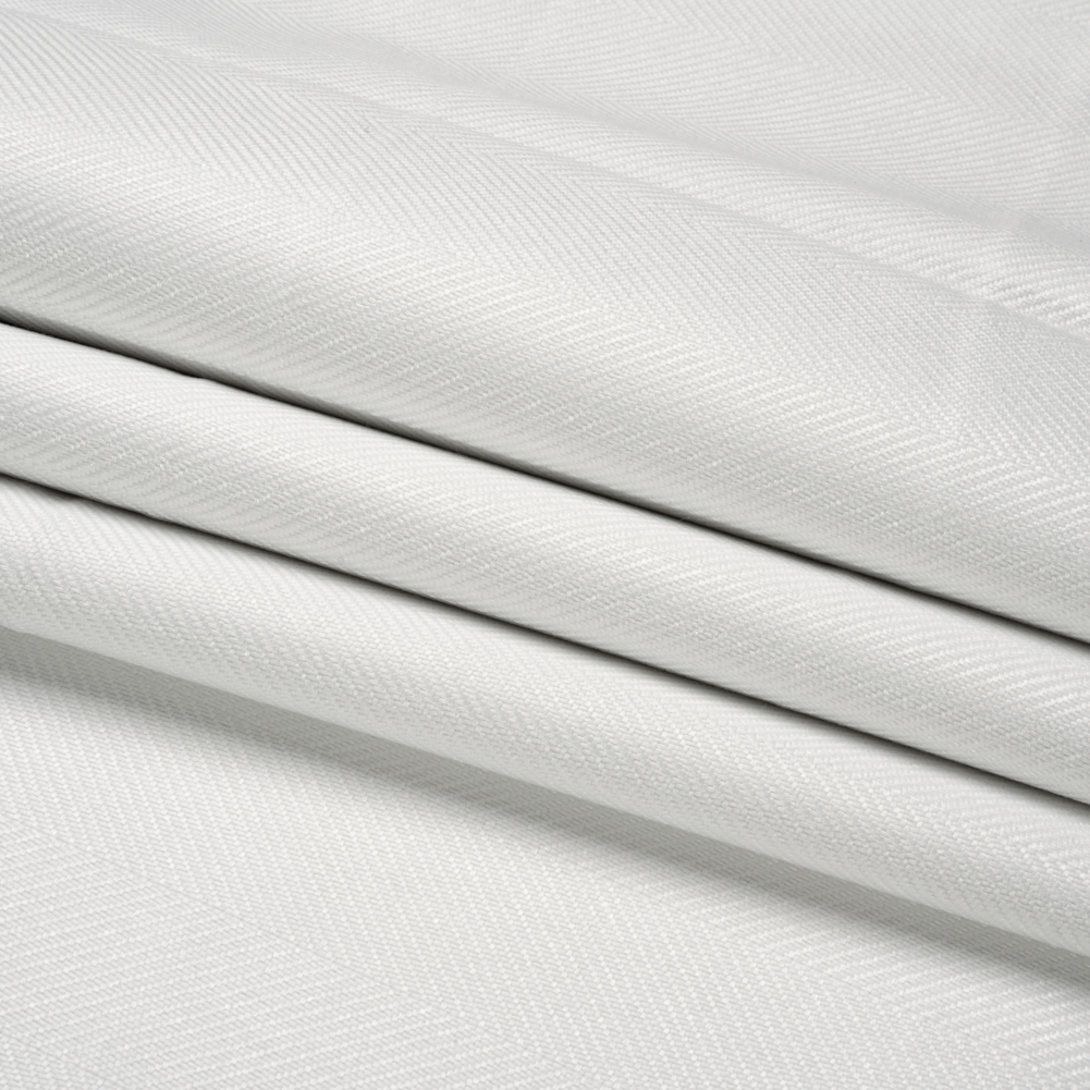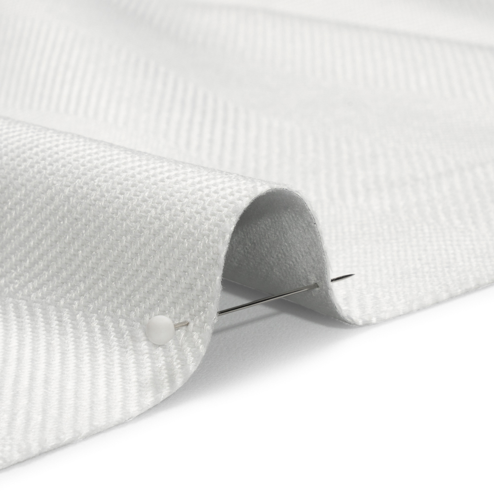 Treat yourself to luxurious curtains without the sacrifice of practicality with this Tillery White Herringbone Striped Blackout Polyester Drapery Twill! This heavyweight fabric displays a collection of fine details that create a luxurious feel. Constructed with a herringbone weave, soft, lustrous diagonal ribs form stripes throughout the white face while the back is a slightly fuzzy material. Total sun block-out is guaranteed with these curtains; enjoy an afternoon nap, a lazy morning, and a midday movie in the dark! Plus, it acts as an extra layer of insulation from the sun's hot rays. The surprisingly malleable drape is perfect for long, pooling curtains or shorter panels. Due to the nature of this heavyweight fabric, a lining is not necessary.