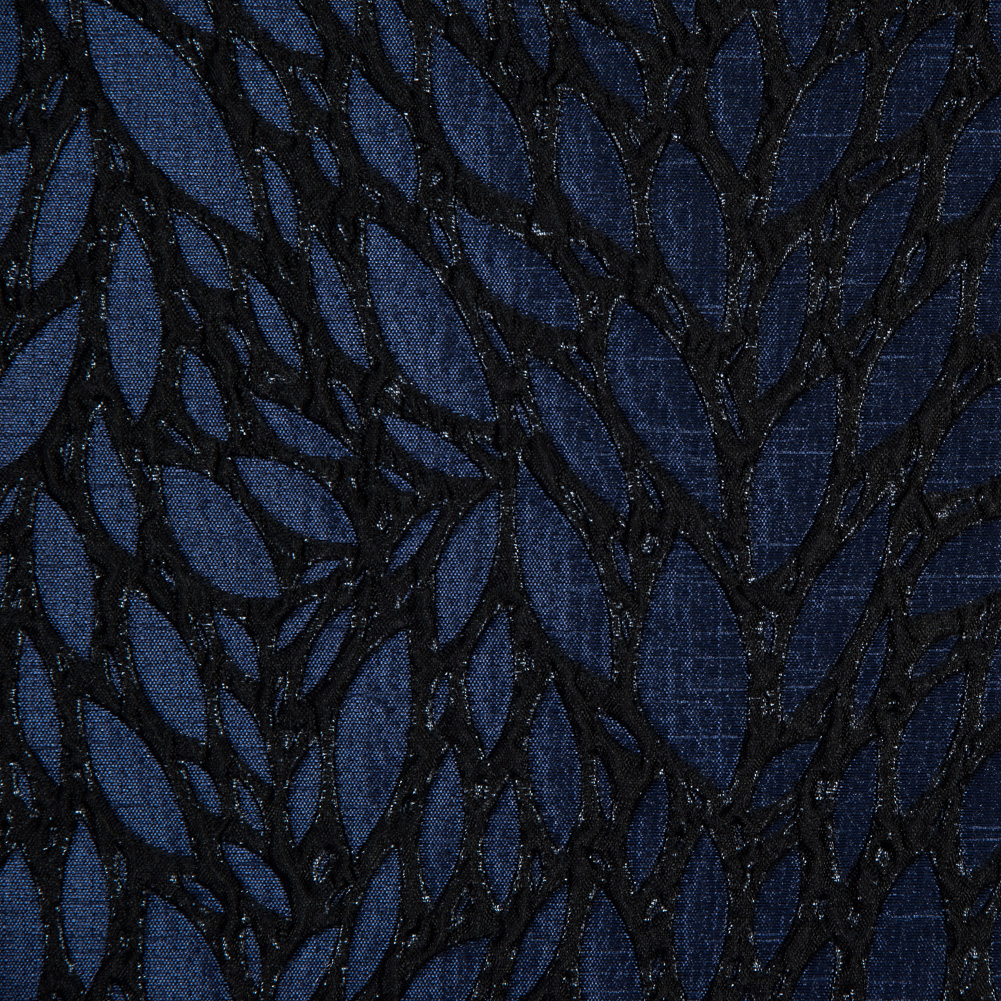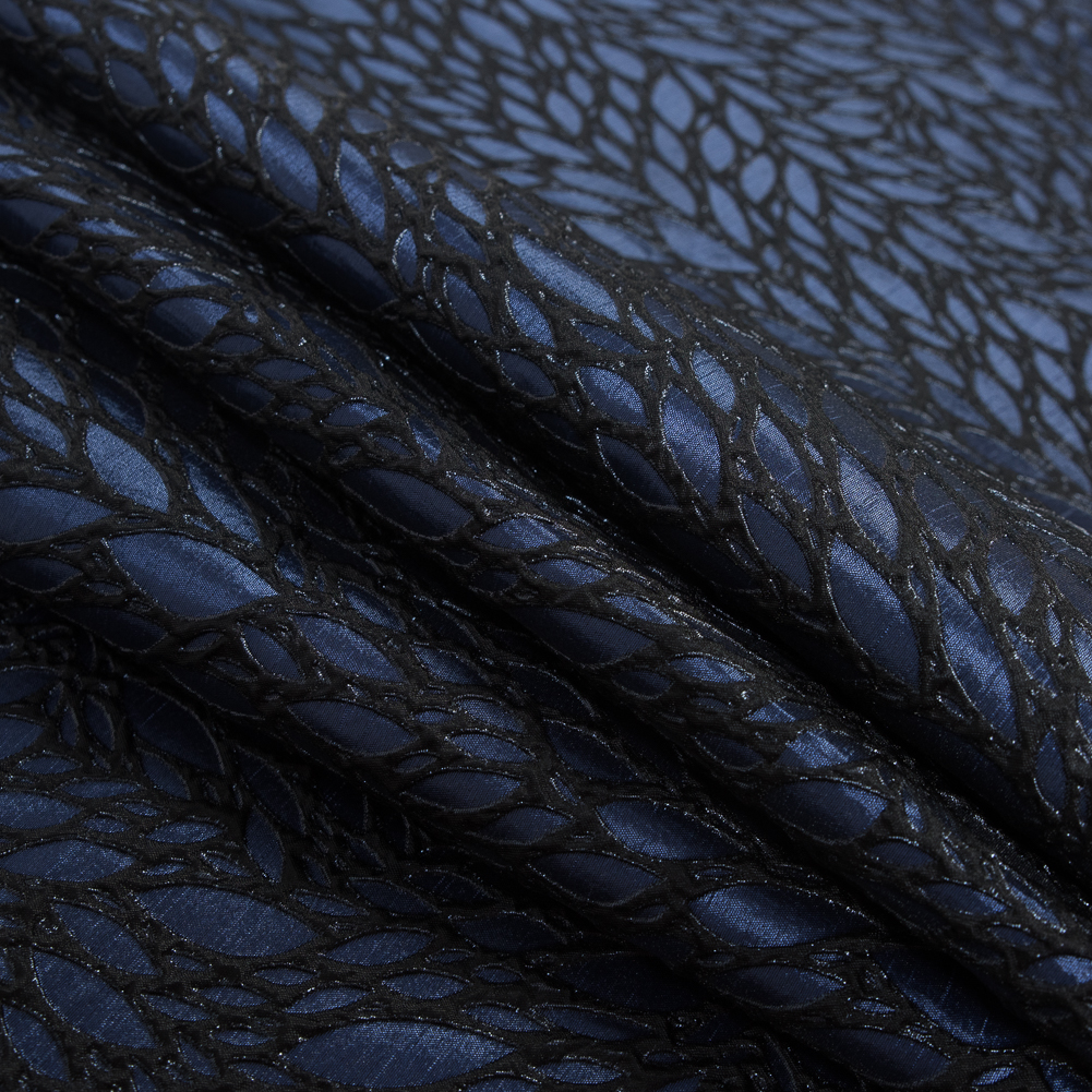 For your next power dress, don't settle for anything less than our Blue and Black Luxury Abstract Metallic Brocade. A densely packed, leaf-shaped pattern breaks up a deep blue background, giving this fabric a chic, effortlessly cool look fit for the runway. Combined with the fantastic two-tone coloration, the raised surface really allows the zany design of this metallic brocade to pop. It has a crisp hand and a billowy drape, making it a fantastic choice for your drop-dead gorgeous sheath dresses, ball gowns, and more. Opaque, a lining may be added for comfort.