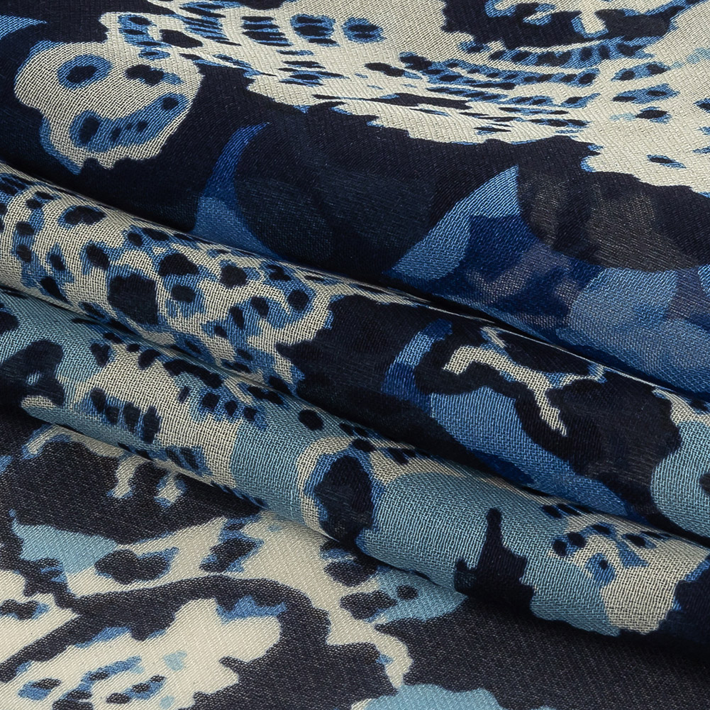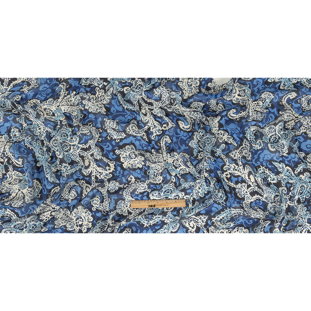 Dive deep into the underwater world of our Blue and Cream Floral Silk Chiffon! The abstracted cobalt and white floral print reminds you of majestic waves and sea creatures, with a flowing drape and pebble-smooth feel adding to its Atlantean qualities. Create wave-like draped gowns or dignified wide-leg trousers. This fabric is sheer, therefore most projects will require a lining.
