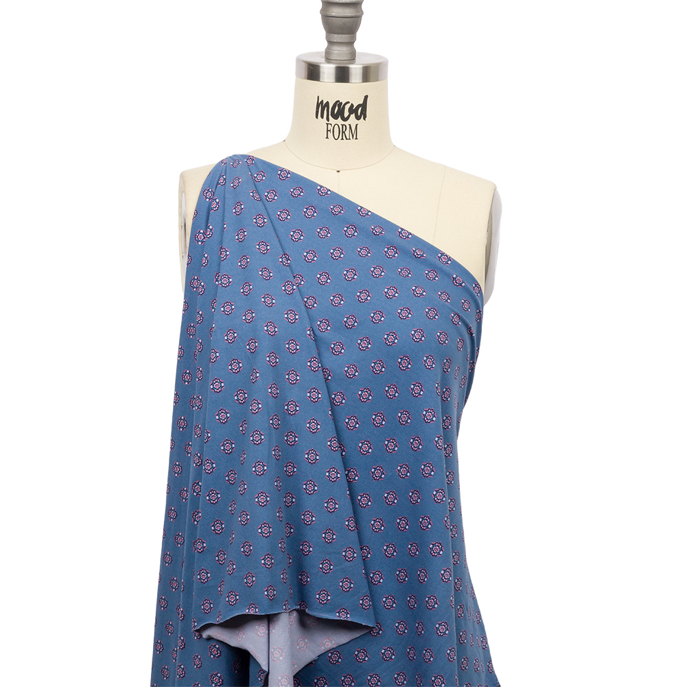 There is no need to sacrifice style for comfort thanks to this Blue and Pink LIttle Medallions Stretch Polyester ITY Knit! Floral-like medallions of pink, blue, and white hues decorate a grayish-blue background. ITY knits are known for a super soft hand, generous elasticity, and breathability—this fabric is no expectation. Feel the hug of this comfortable fabric on your skin with slouchy tees, enjoy the flexible 100% all-way stretch with bodycon dresses, and enjoy the supple drape with wide-legged pants and wrap dresses!