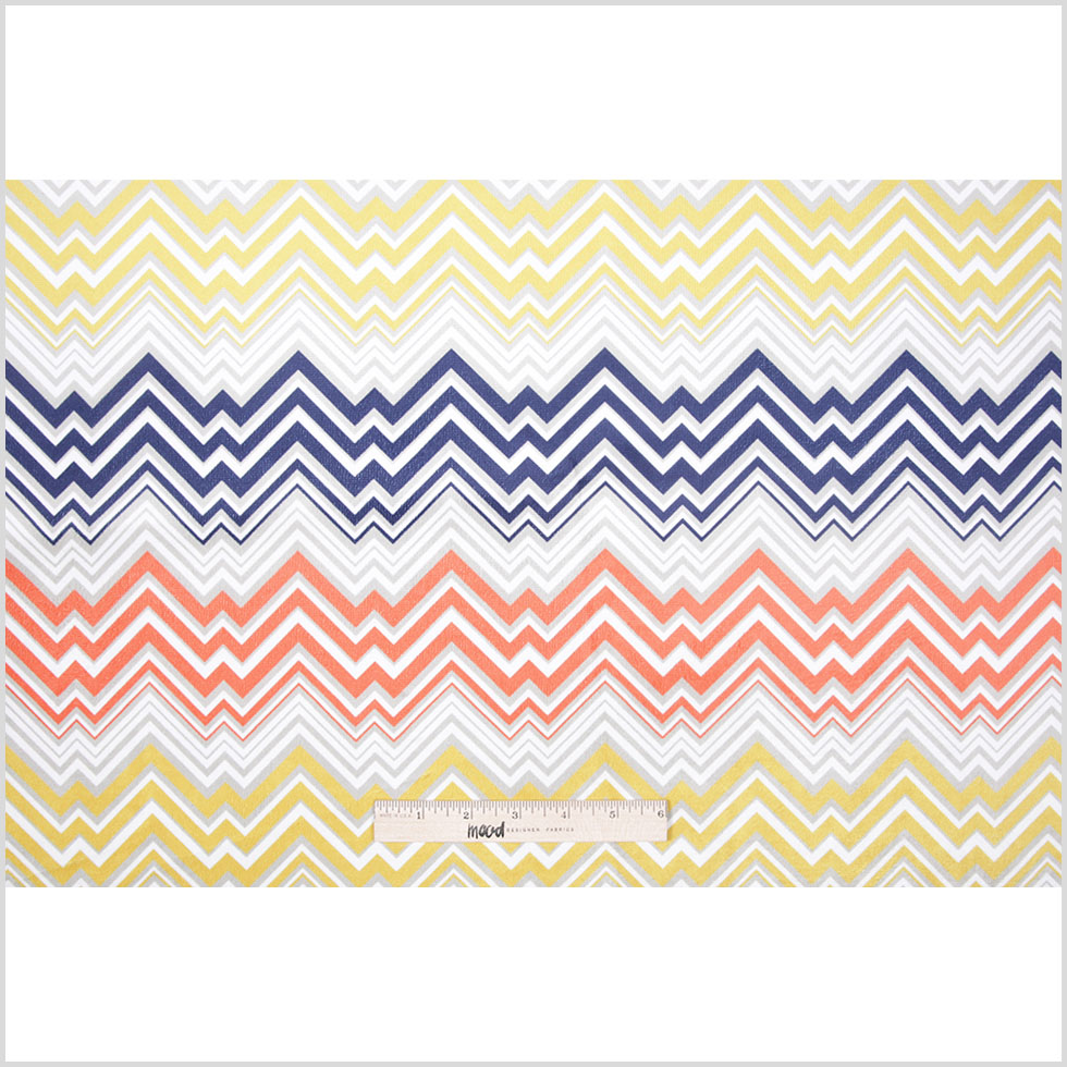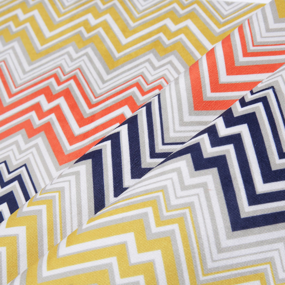 Step into the realm of captivating colors by adding this dynamic print to your future interior design plans. Presenting a bold zig-zagging geometric velvet involving a collaboration of oranges, yelliows and blues. At a distant, this material comes off as if it were a typical woven or even a vinyl, but once your hand meets its surface, the intensity of its softness proves irresistible. This polyester velvet was produced with very short stable fibers which result in little to no sheen and a remarkably short pile. Backed by canvas, this home decor velvet fabric is great for upholstery projects such as seat cushions and couch covers.