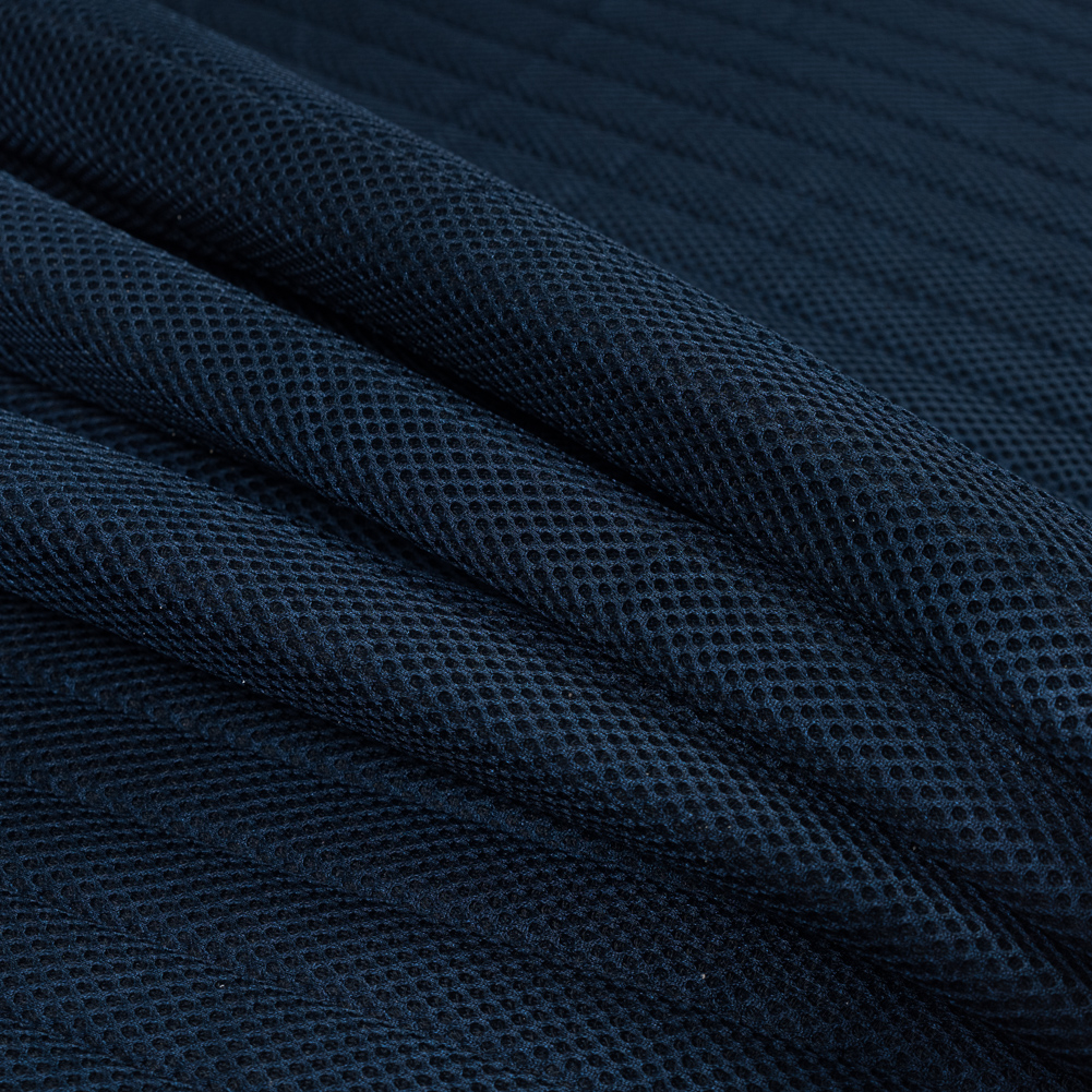 For sporty chic outerwear, check out this Blue Linear Ribbed Mesh Quilted Coating! A dark blue mesh is stitched into a ribbed design giving it an extra dose of texture. Thick and lightweight, we see bomber jackets, puffer vests, and avant-garde coats. Experiment with silhouette using its flexible drape. Its cushioned filler is open in the back, so a lining may be desired. WARNING: Cancer and Reproductive Harm - www.P65Warnings.ca.gov.