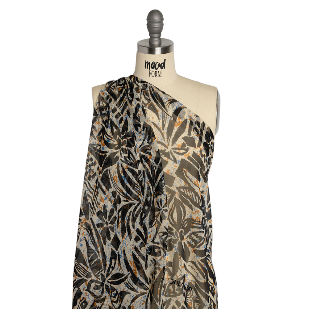 This Blue, Orange and Black Wax Resist Floral Silk Chiffon presents design opportunities you won't be able to resist! Recalling simple yet evocative designs etched into clay pottery, black flowers, leaves, and geometric shapes stand out against a blue and orange paint-splattered background.Romanticize any silhouette with silk chiffon’s sheer quality and airy drape. A slightly grainy hand accompanies this ethereal fabric, inspiring floor-length gowns, dusters, blouses with ruffled sleeves, scarves, and more. A tip from our sewists: do not feel intimidated by sewing this delicate fabric; using a rotary cutter (or sharp scissors and sharp pins), fine needles, tight stitching, French seams, and patience, anyone can show up to a special occasion wearing a silk chiffon garment they created themselves!