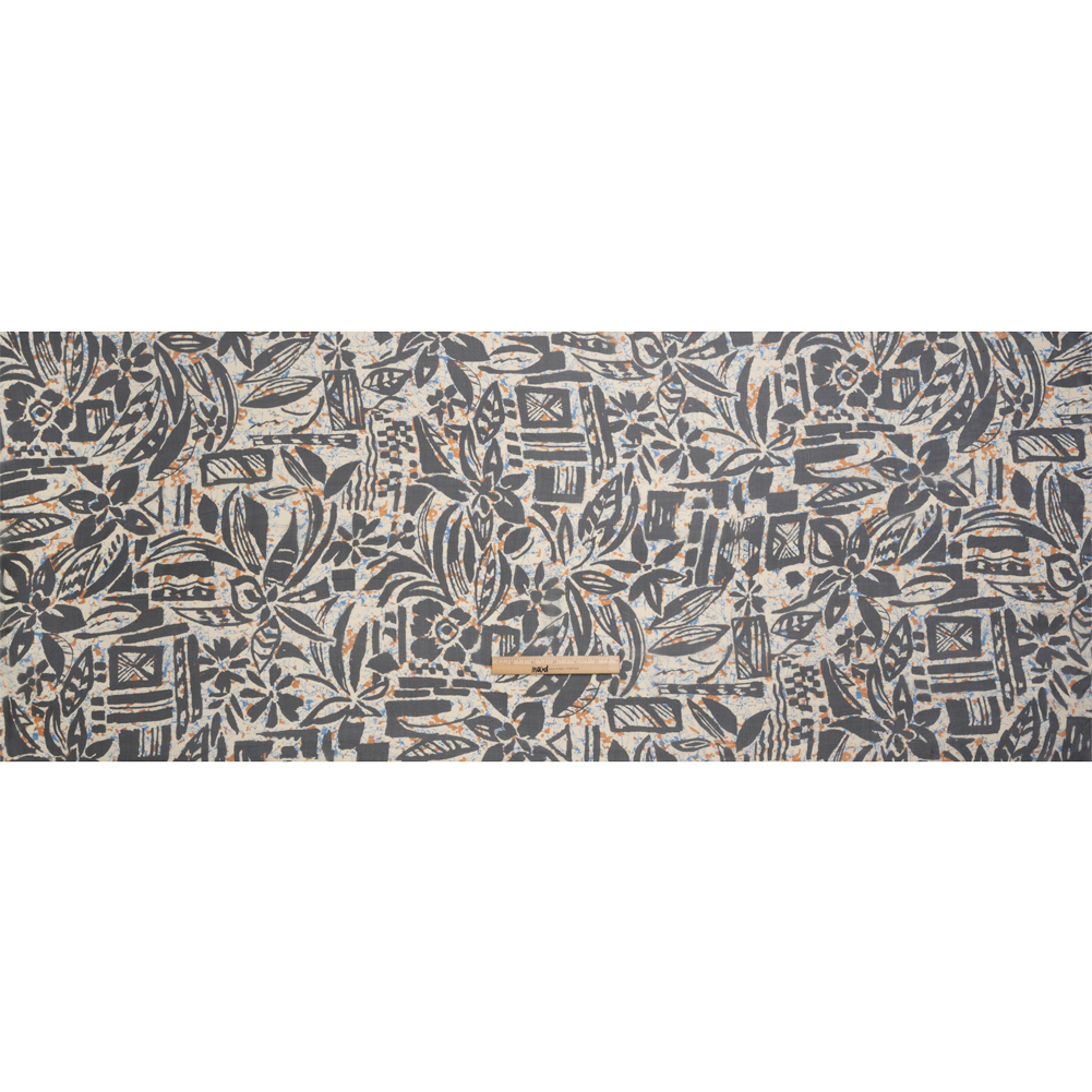 This Blue, Orange and Black Wax Resist Floral Silk Chiffon presents design opportunities you won’t be able to resist! Recalling simple yet evocative designs etched into clay pottery, black flowers, leaves, and geometric shapes stand out against a blue and orange paint-splattered background.