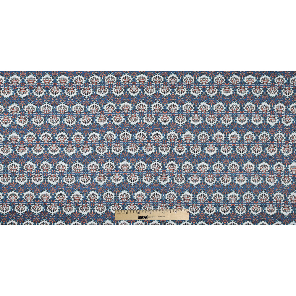 Combining ethnic motifs with a touch of floral imagery as well as a somewhat geometric layout, this 32s combed cotton sateen would work best sewn into Spring and Summer dresses, skirts, children’s wear and pajamas.