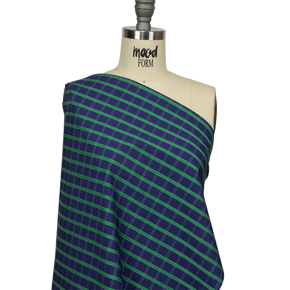 For a bold, dynamic look, there's no better option aside from Mood's Blueprint and Green Plaid Cotton Shirting with Satin-Faced Stripes! Faded green stripes intersect lustrous, satin-faced stripes of the same color, all over a cobalt blue ground. Crisp in hand with a satisfying snap, shirts and shirt-dresses as well as gathered skirts and crop tops are optimal applications for this material. Opaque, a lining is not of necessity for top-weight applications.