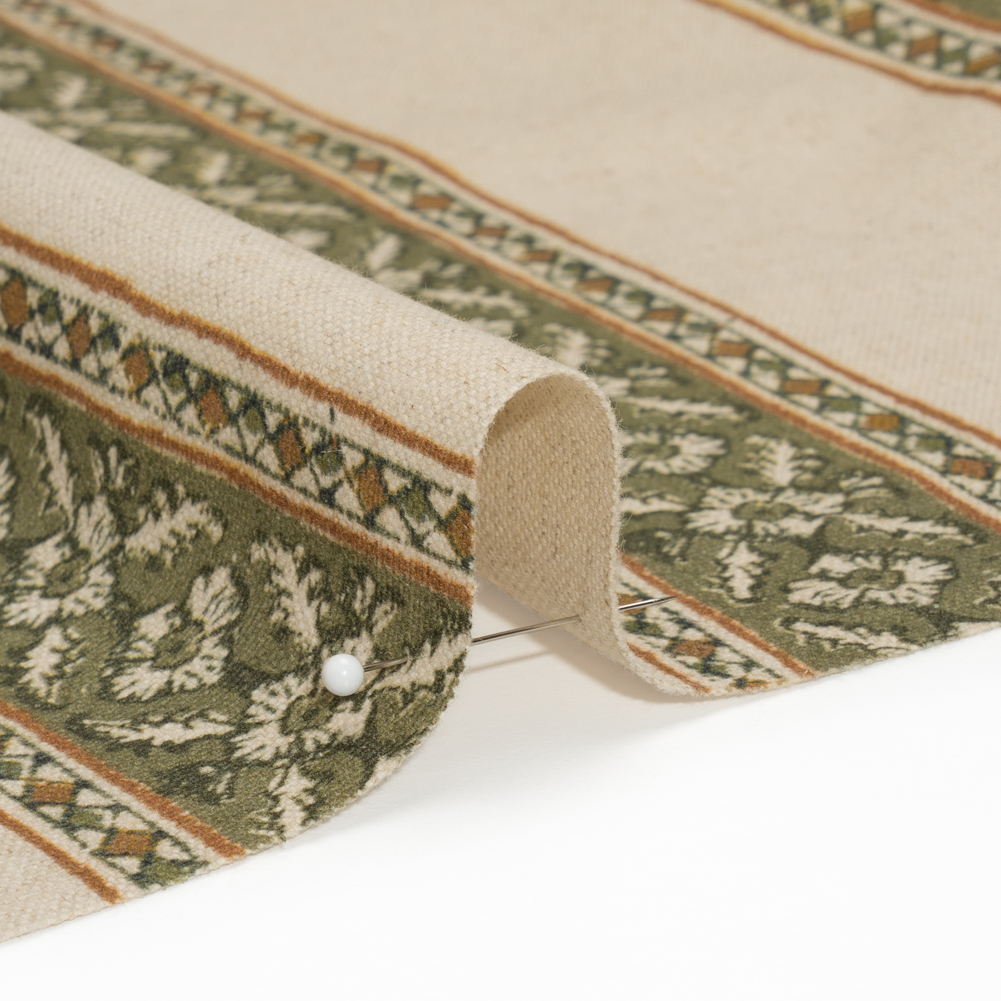 This Oregano Flowers and Diamonds Stripes Brushed Canvas features a sturdy but soft feel, while geometric and floral patterns stripe a heathered beige background in olive and burnt orange.
