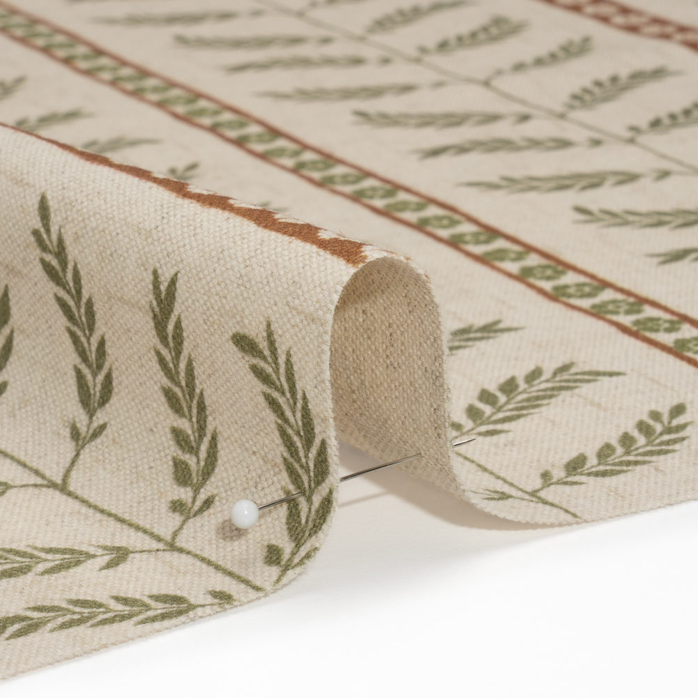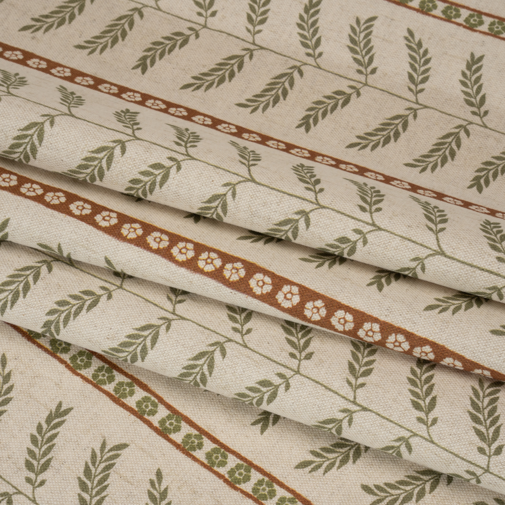 With a blend of linen and cotton fibers, this Spice Fern Leaves and Flower Stripes Brushed Canvas offers a soft hand and semi-structured drape.