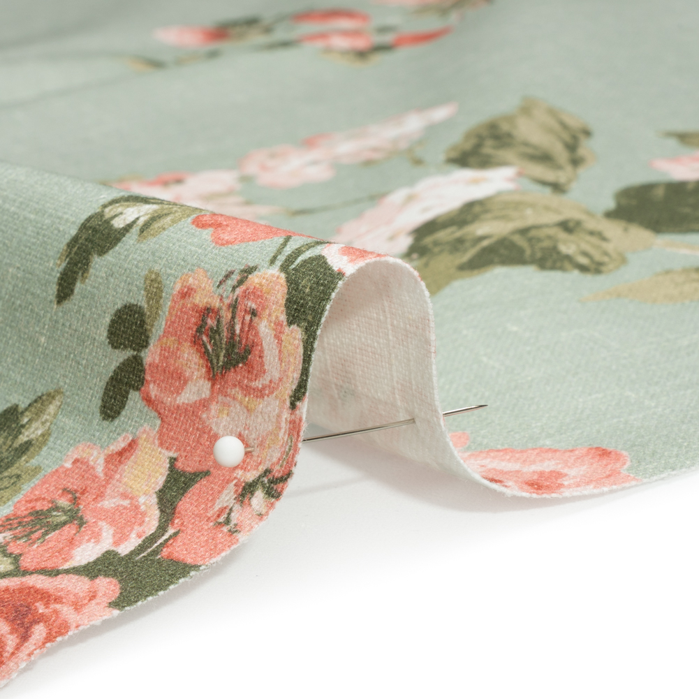 Inspired by romantic getaways in the French countryside, this British Imported Sage Elegant Floral Brushed Cotton Canvas carries elegance into your home. A sage background hosts pink and red hydrangeas and roses, featuring beige markings that create a vintage, hand-painted feel. It has a semi-structured drape and a soft and slightly slubbed hand. Slightly translucent; a lining may be desired. The artist in you is pulled to canvas, a versatile fabric that presents itself like art, curating ease and refinement in your home. This floral pattern charms kitchens with valances and inspires light upholstery projects (like throw pillows and headboards)—plus, in admiration of its stability, wardrobes can be refreshed with structured jackets and tote bags!