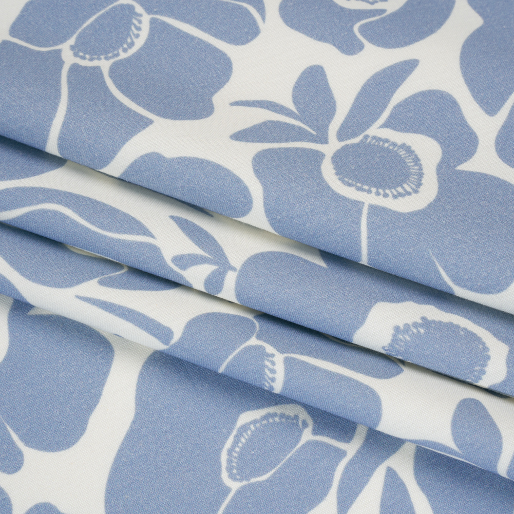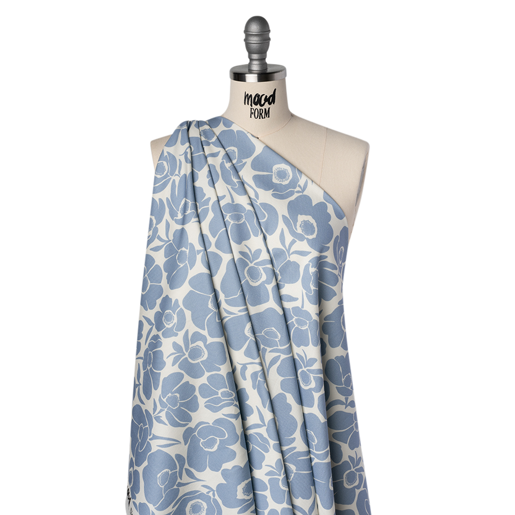 This Blue Mood Exclusive Poppy Impressions Brushed Cotton Woven will carry you on a gentle breeze towards your next design—featuring a soft, smooth hand and malleable drape.Suggested Projects: Dresses, Pants, Skirts, JacketsContent: 97% Cotton, 3% ElastaneStretch: 10% WeftwiseOpacity: OpaqueMake sure to stop and get a stamp after your visit to the poppy field atop this cotton woven. Against an off-white backdrop, simple dusty blue poppies dance like a repeating stamp—each bloom adding a charming, hand-printed touch to your creations. Brushed to bring out its soft, smooth fibers, this fabric is made for all-day comfort, whether you’re in the office or enjoying the sun. With a 10% stretch through the weft and a malleable drape, it moves with you while holding its shape for tailored looks. We envision chic cigarette pants, sheath dresses, lightweight blazers, and more! Opaque, a lining can be added for structure but is not required.