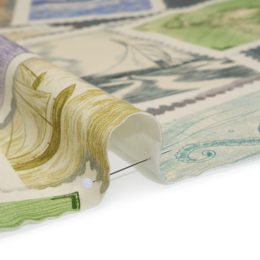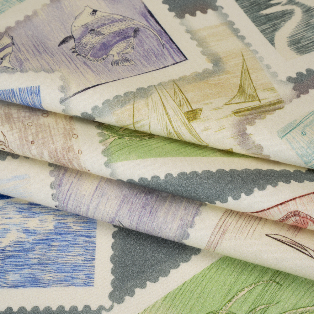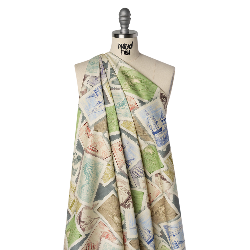 Signed, sealed, and delivered! Our Mood Exclusive Seaside Stamps Brushed Cotton Woven is a playful pick for nautical-themed garments or vacation-ready styles. Suggested Projects: Dresses, Skirts, Blouses Content: 97% Cotton; 3% Elastane Stretch: 10% Weftwise Opacity: Opaque This eclectic print features a vibrant collage of illustrated postage stamps, each one framing scenes of oceanic life—sailboats gliding on the tide, octopi with curling limbs, elegant banded angelfish, and dainty seahorses. Rendered in vivid shades of blue, purple, red, yellow, and green, the images sit atop a deep gray ground that peeks subtly between the beige-edged stamps, adding depth and contrast without overpowering the artwork. The brushed cotton surface offers a soft, cozy feel with a hint of stretch for ease, while the opaque weave and medium weight give it structure for blouses, skirts, and charming dresses alike. Each cut of this fabric feels like a keepsake from a dreamy coastal escape.