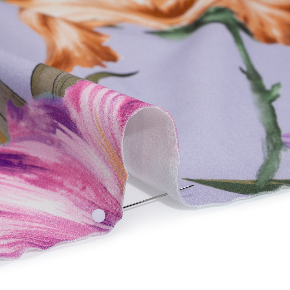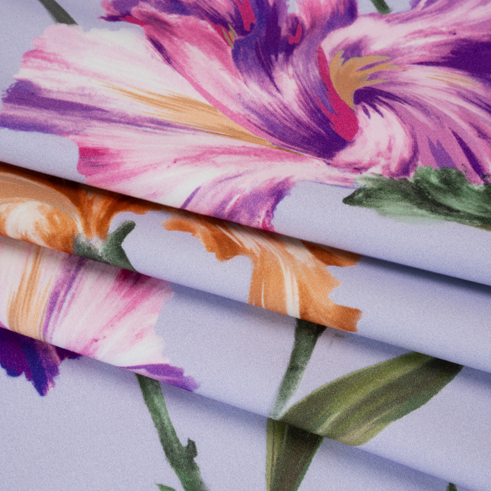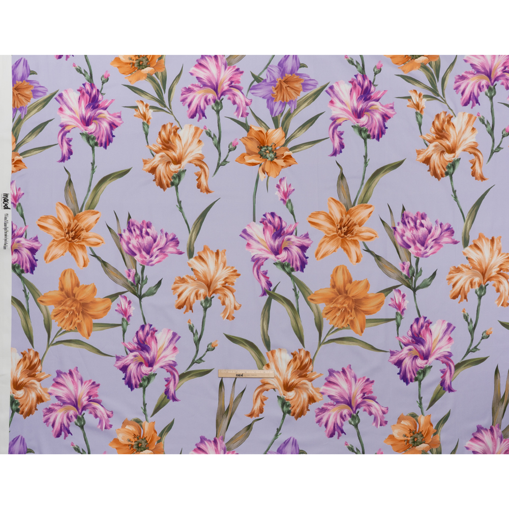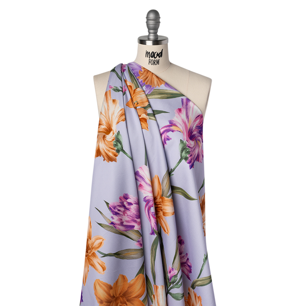 Follow the poetic flow of this Lavender Mood Exclusive Language of Lilies Brushed Cotton Woven to your design destinations—featuring a soft, smooth hand and malleable drape.Suggested Projects: Dresses, Pants, Skirts, JacketsContent: 97% Cotton, 3% ElastaneStretch: 10% WeftwiseOpacity: OpaqueBig lilies bloom in vivid hues of burnt orange and purple against a lavender sky, swaying gently as if whispering creative secrets to inspire your next masterpiece. Brushed to bring out its soft, smooth fibers, this fabric is made for all-day comfort, whether you’re in the office or enjoying the sun. With a 10% stretch through the weft and a malleable drape, it moves with you while holding its shape for tailored looks. We envision chic cigarette pants, sheath dresses, lightweight blazers, and more! Opaque, a lining can be added for structure but is not required.