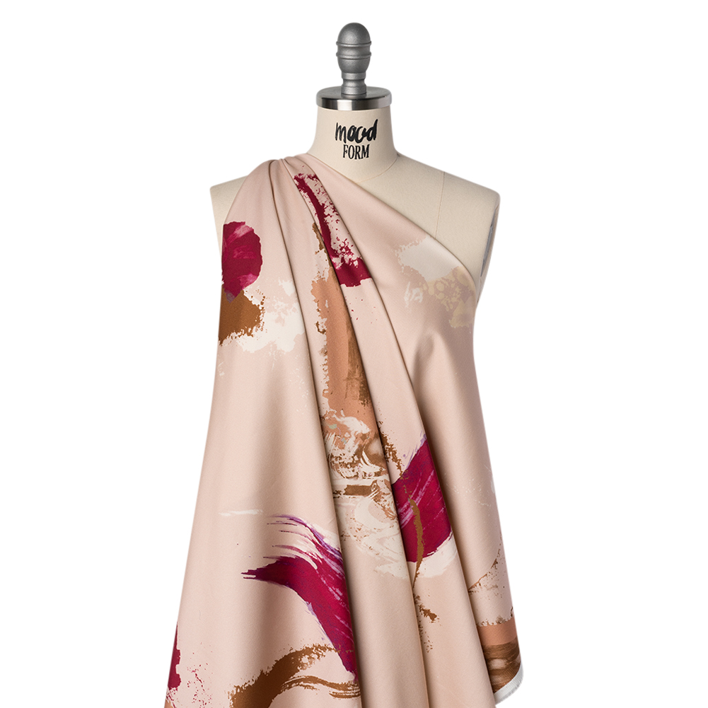 Weather the style storm with our Mood Exclusive Dust & Drizzle Brushed Cotton Woven—ideal for puff-sleeved blouses or painterly pleated skirts. Suggested Projects: Dresses, Skirts, Blouses Content: 97% Cotton; 3% Elastane Stretch: 10% Weftwise Opacity: Opaque A whimsical wash of peachy beige, raspberry pink, white, and soft brown splashes across a rose-tinted backdrop, evoking the spontaneity of a studio in mid-creation. The paint strokes and splatters vary in intensity, creating an organic rhythm that feels both modern and artfully undone. Soft to the touch with a subtle brushed finish, this cotton woven has a gentle weftwise stretch and a flexible yet stable hand, making it well-suited for shirtdresses with gathered waists or button-ups with a twist. Its opaque coverage and medium weight make it an easy choice for transitional wardrobes — especially when you're caught between sunshine and scattered inspiration.