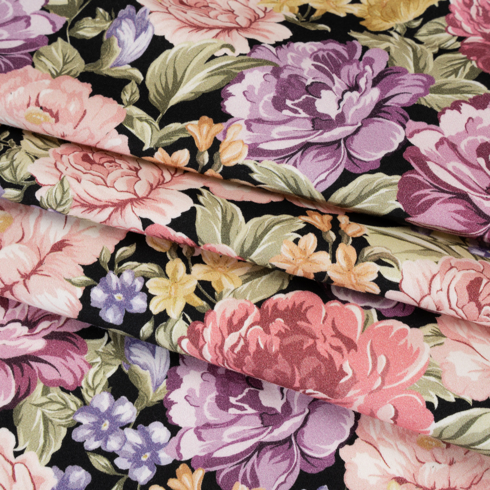 Stop and smell the roses with our Mood Exclusive Tender Bloom Brushed Cotton Woven—a delightfully soft, slightly stretchy fabric ideal for comfortable yet polished dresses and blouses.Suggested Projects: Dresses, Skirts, BlousesContent: 97% Cotton; 3% Elastane Stretch: 10% Weftwise Opacity: Opaque This fabric showcases an array of pink, mauve, and purple roses in bloom, accented with lush leafy greens. Smaller yellow and purple flowers add delicate pops of color across the rich black background, creating a harmonious and elegant floral composition. The cotton weave offers a soft surface with a gentle stretch, perfect for tailored yet comfortable garments. Its opaque quality ensures full coverage, making it a versatile choice for dresses, skirts, and blouses that require both structure and ease.