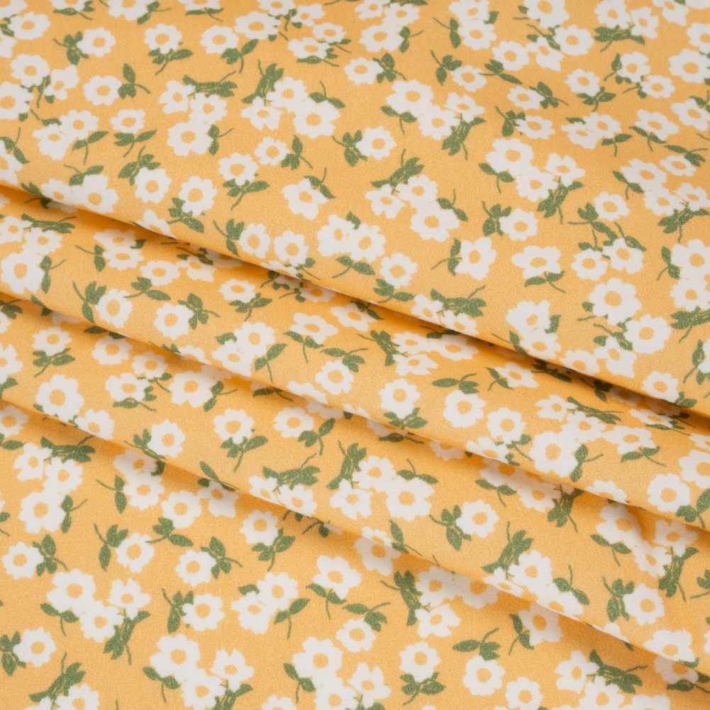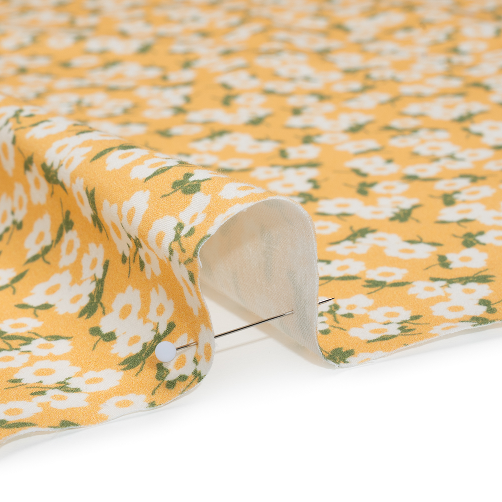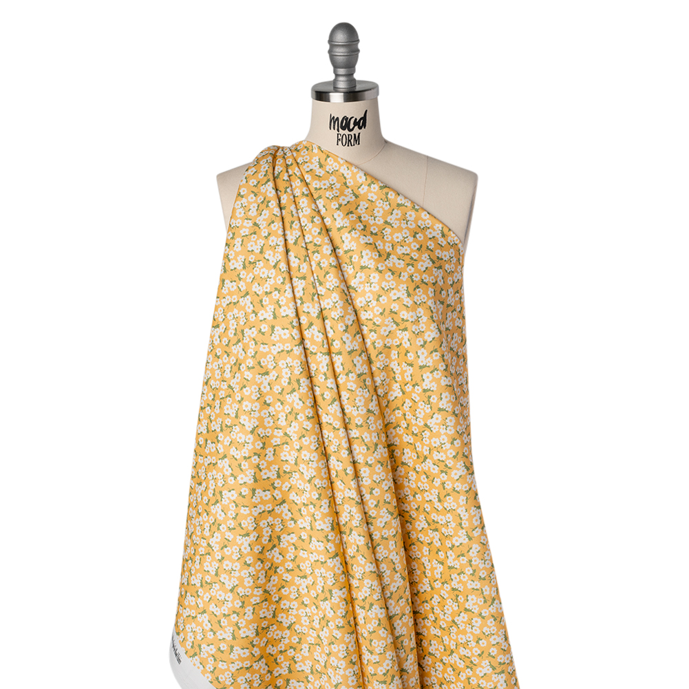 Put yourself in a field of dreams with our Mood Exclusive Daisy Daze Brushed Cotton Woven—boasting a soft hand and gentle stretch, this fabric is ideal for breezy skirts, playful blouses, and charming dresses.Suggested Projects: Dresses, Skirts, Blouses Content: 97% Cotton; 3% Elastane Stretch: 10% Weftwise Opacity: Opaque An array of small white daisies with delicate leafy green stems scatter cheerfully across a warm, sunny yellow ground, creating a fresh and uplifting pattern. The cozy brushed surface adds a soft, breathable feel, while the medium weight and gentle weftwise stretch provide comfortable wear and ease of sewing. With full opacity, this fabric lends itself beautifully to flared skirts with pockets, puffed-sleeve tops, and tiered sundresses that bring both whimsy and practicality to your wardrobe.