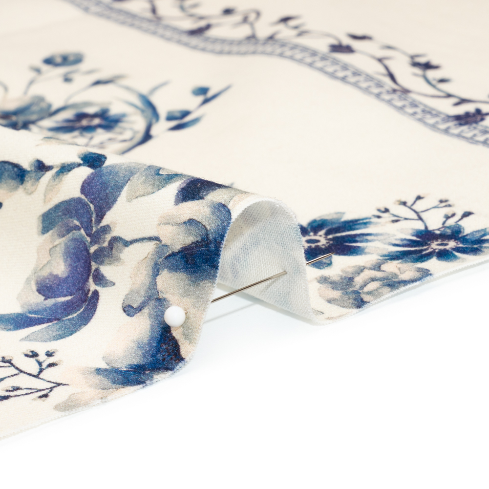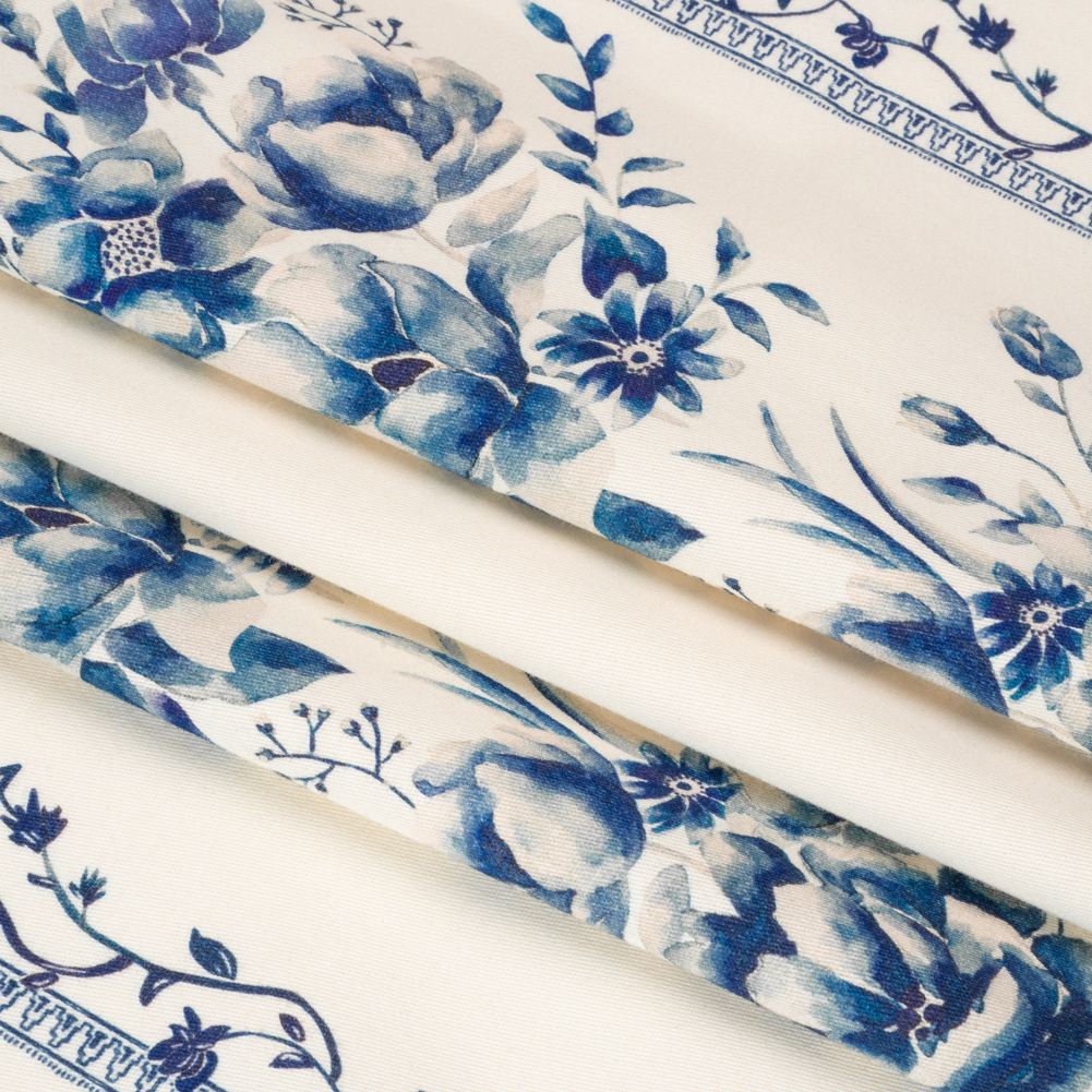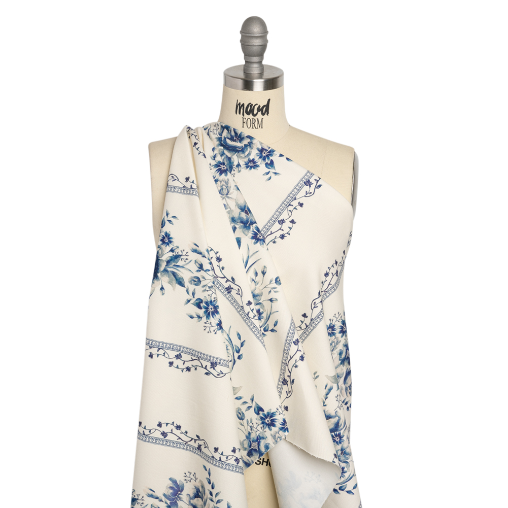 Grecian gardens expand to your left and right as you walk down a marbled pathway to our Mood Exclusive Navy Pathway to Paradise Brushed Stretch Cotton Twill. Blue watercolored flowers run through avenues lined with ornate borders and rose vines, bringing life to an off-white background. A brushed finishing technique exaggerates the cotton fibers, introducing a slightly fuzzy feeling to the otherwise dry hand and emphasizing its lightweight comfort. From winter wardrobes to summer styles, the crisp drape appeals to semi-structured silhouettes, like boxy button-ups and shift dresses, and the 15% weft-wise stretch inspires flexible chinos and tailored blazers! Though mostly opaque, a lining will increase opacity and structure if desired.