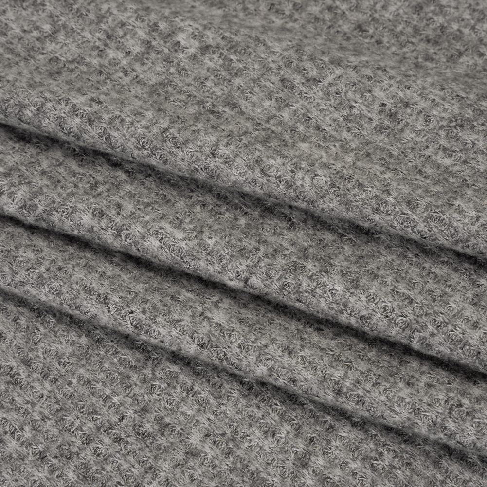 Enjoy the gentle serenity of early mornings wrapped in this Heathered Light Gray Brushed Stretch Waffle Sweater Knit—featuring an ultra-soft hand and fluid drape.Suggested Projects: Cardigans, Skirts, Tops, LoungewearContent: 76% Rayon, 21% Polyester, 3% ElastaneStretch: 50% Weftwise, 30% WarpwiseOpacity: TranslucentThis heathered light gray knit wraps you in endless cozy comfort. A brushed finish lends this waffle-knit an irresistibly soft touch—perfect for wrapping yourself in comfort and calm. With its fluid drape and 50% stretch through the weft (plus a little extra through the warp), it transforms beautifully into slinky cardigans, front-tie tops, wrap skirts, and luxurious loungewear that feels as good as it looks. Translucent, we recommend layering or self-lining for added opacity.