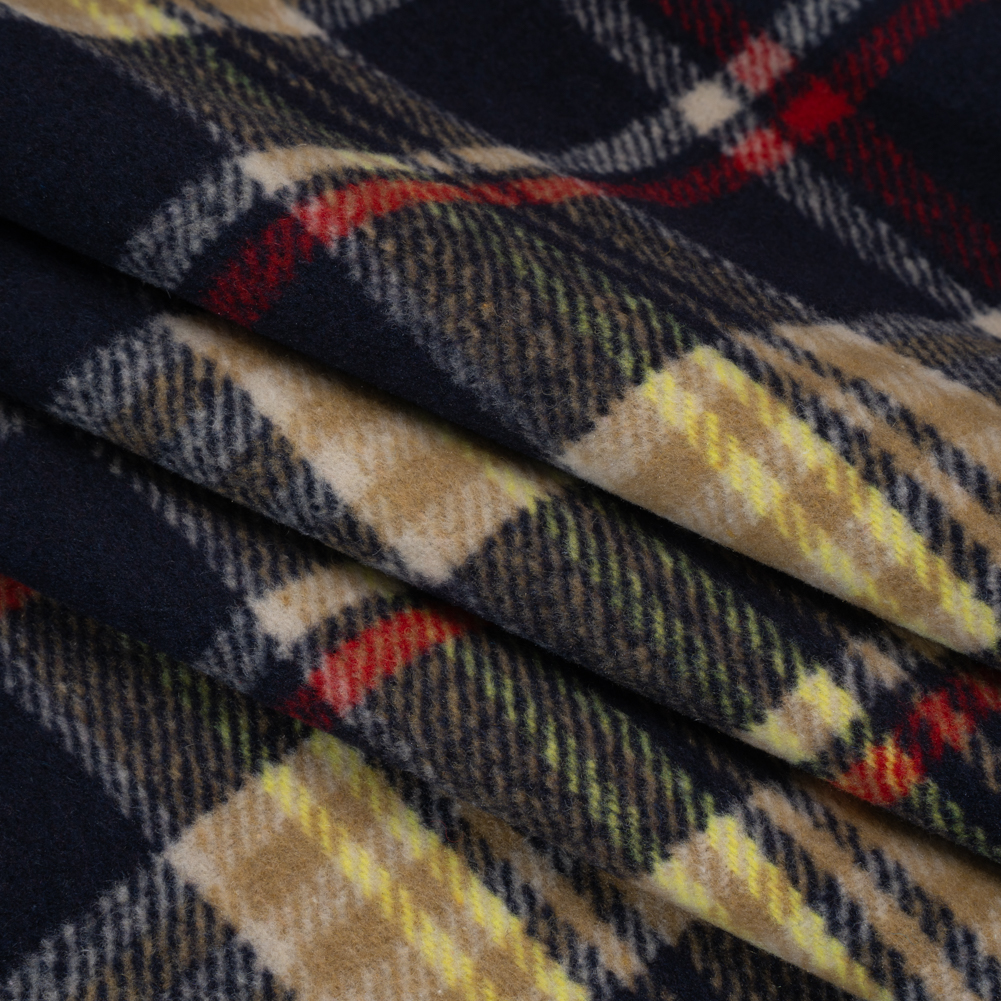 Keep cozy and warm with this Plaid Brushed Wool Blend Twill, featuring a fuzzy, soft hand and supple drape.Suggested Projects: Coats, Jackets, Dresses, SkirtsContent: Wool, AcrylicStretch: NoneOpacity: OpaqueNavy, red, beige, and lemon yellow lines overlap to create a plaid design. A fuzzy, soft hand graces the face—thanks to a brushed finish—and the reverse holds a tactile hand. With a supple drape and moderate weight, use this twill to craft coats, tailored jackets, buttoned capes, and Chanel-inspired sets. Opaque, a lining isn’t necessary for most applications.