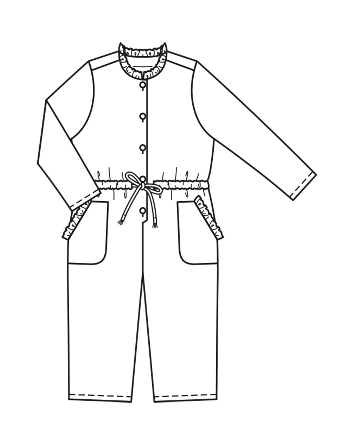 This kids jumpsuit pattern is comfortable, featuring buttons and patch pockets � suitable for both girls and boys. One-piece B has a feminine look with ruffles and a drawstring waist.