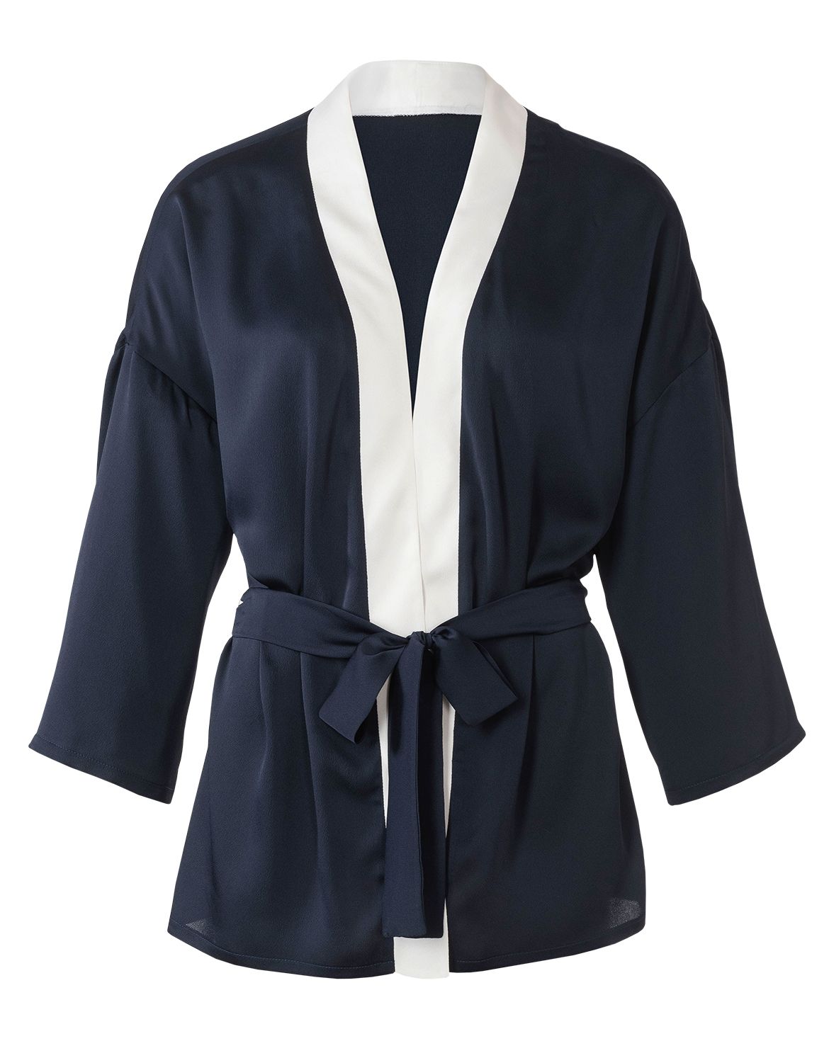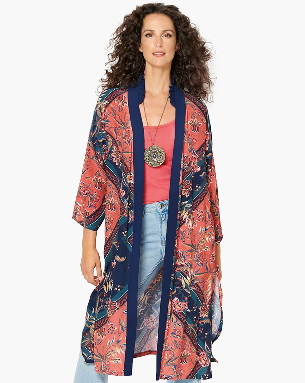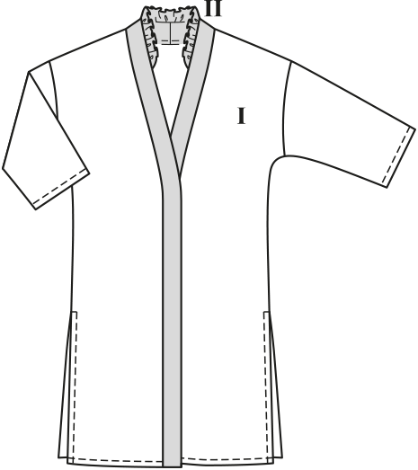 This kimono jacket pattern creates jackets that are particularly eye-catching. Version A is knee-length. Version B reaches to the hips and has a tie belt.