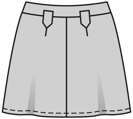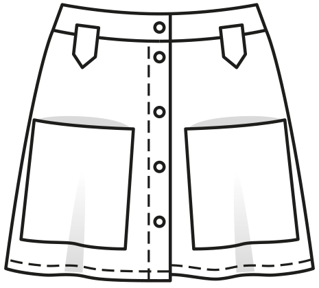 This flared skirt pattern creates skirts that are trendy all year round and look great in mini and midi lengths. The shaped waistband ensures a good fit, while the flared shape provides comfort. The pockets and the closure with buttons or simple snaps are eye-catching details.