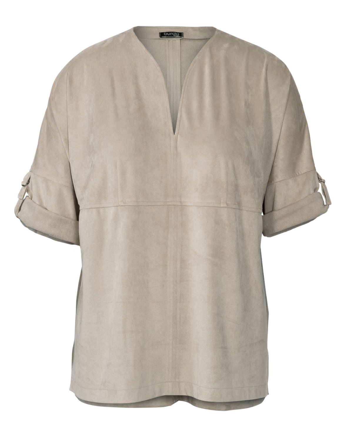 Perfect for both casual and business looks, the dress and blouse feature a flattering neckline and roll-up sleeves. The relaxed straight cut and side slits make them wonderfully comfortable. The pattern is also ideal for working with faux leather.