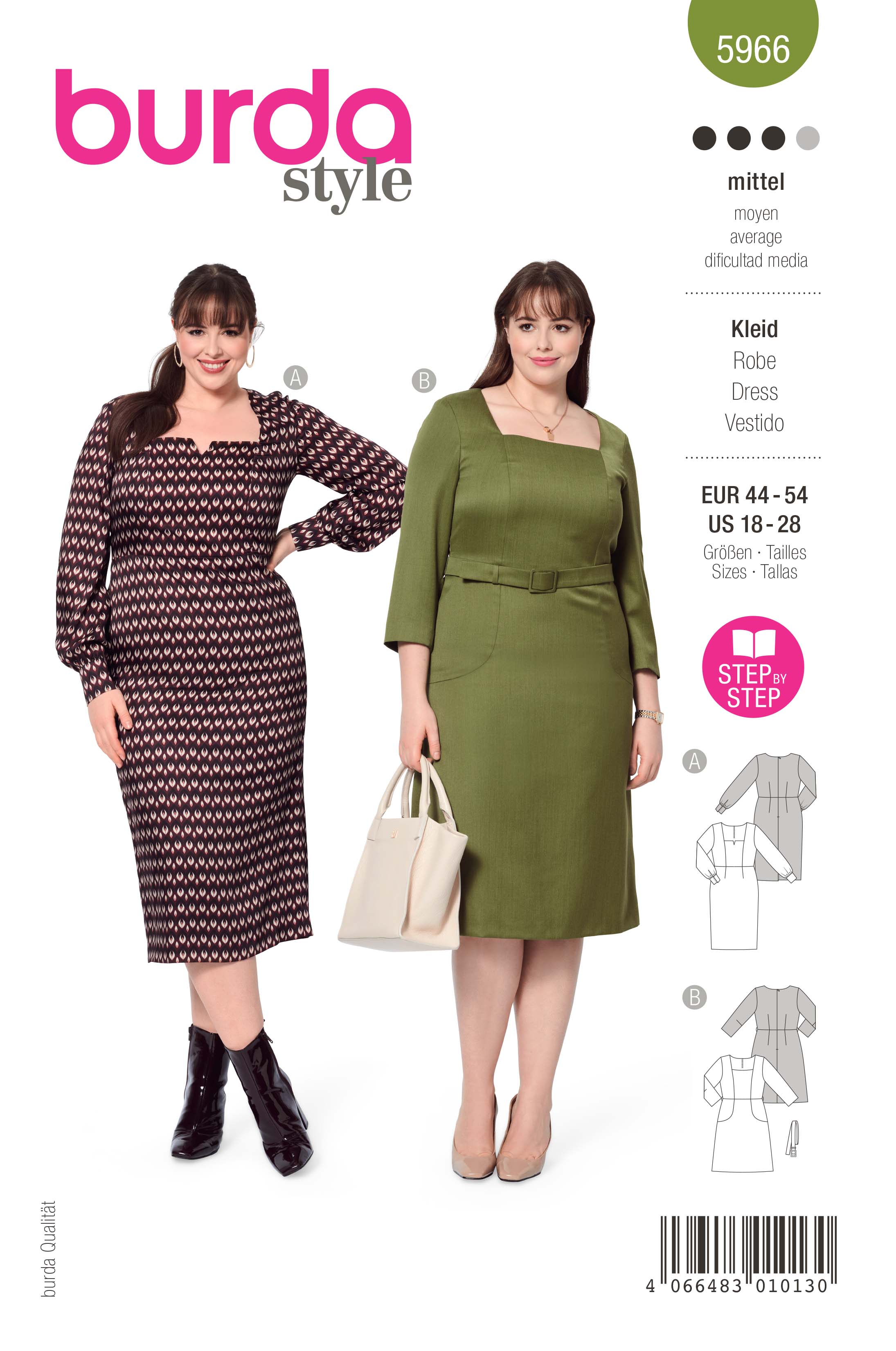 Sometimes a dressier look is in order. You have the choice: A with a slim skirt, wide sleeves with cuffs, and a back slit; B with a slightly flared skirt with yoke and shortened sleeves. A belt made from the same fabric completes the look.