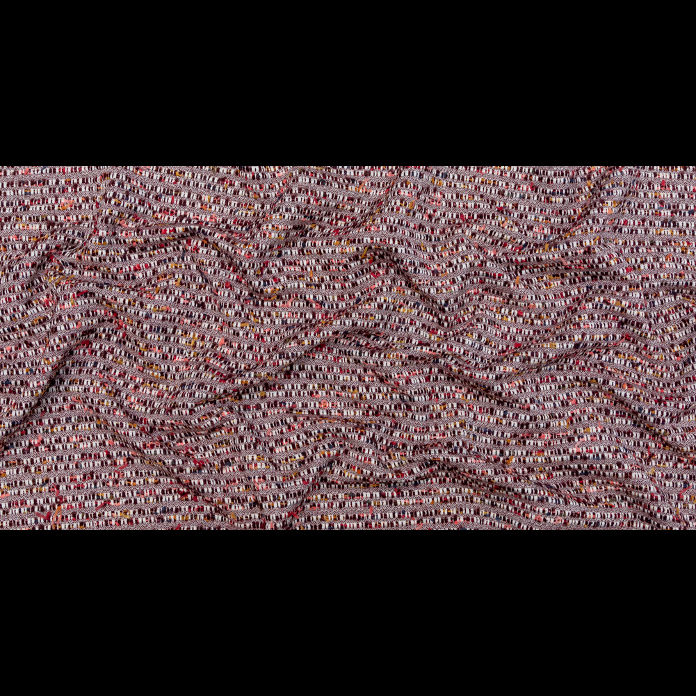 Add some hearty colors to your next couture creation with this Burgundy and White Striped Cotton and Wool Tweed! A novel striped pattern featuring flecks of coral and yellow throughout the fabric is paired with a heavily textured tweed base made from cotton, wool, and polyamide.