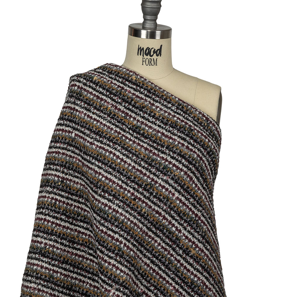 Keep warm and look fabulous with Mood's dazzling Burgundy, Cream and Metallic Silver Striped Boucle Blended Wool Sweater Knit with Black Eyelash Fringe! Knit stripes in fall-favorite shades, such as mustard yellow, burgundy and cream, are mixed with sparkling black eyelash fringe for a luxe touch. Soft, fuzzy, and tactile, this sweater knit features a heavy, pliable drape perfect for cold-weather couture. With 25% all-way stretch, try daring crop tops and sweater skirts, or classic cardigans and pullovers. Opaque, a lining is not necessary for the majority of projects.