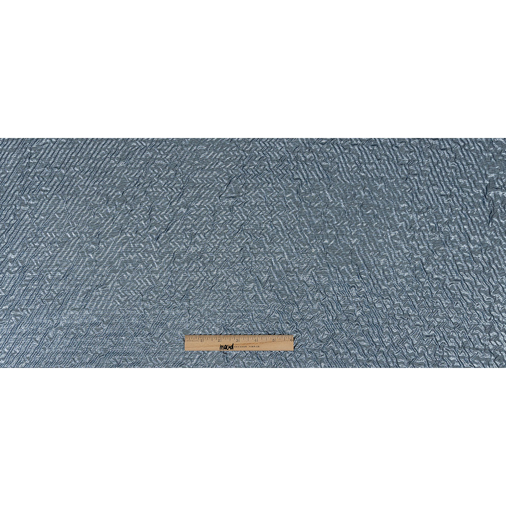 Soar above the clouds with this Metallic Sky Blue Wavy Luxury Brocade! A metallic light blue river ripples across the surface of this fabric, while the reverse side is awash with a shimmering black hue. Add textural interest to simple jackets and dresses as light plays over a raised, bubbly pattern. The voluminous and softly structural drape makes for brilliant ball gowns, too. Translucent, add a lining for opacity or additional structure if desired.