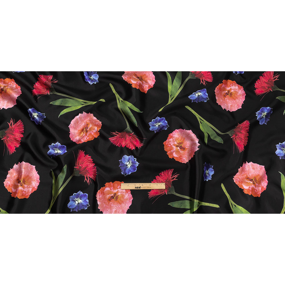 Channel your inner fairy princess with this magical Blue, Pink and Black Floral Silk and Polyester Mikado, courtesy of Carolina Herrera! Photorealistic flowers bloom in vibrant shades of pink, coral, and blue, all over a stark black ground. Mikado combines the structured and voluminous drape of a twill with the sheen of a satin, all finished with a subtly woven texture. Use it for dramatic evening gowns and bridesmaid dresses, or try crisp trousers with matching suit jackets. Opaque, a lining may be desired for a polished finish but isn't strictly necessary.