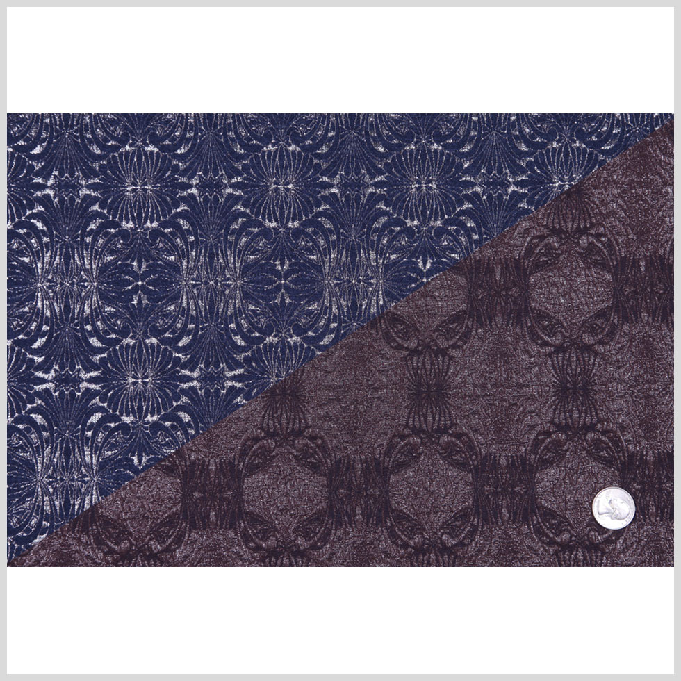 Ah, Carolina, your fabrics are so lovely and this double-sided brocade is no exception! One side is a navy and metallic gray design, while the other is a contrasting chocolate brown with a slight sheen.
